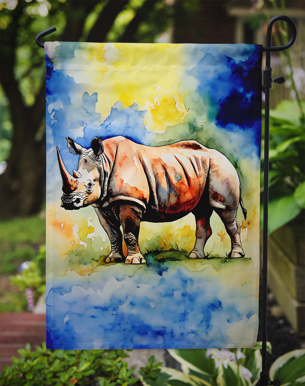 Garden Flag featuring breed specific Rhinoceros artwork. Enhance the beauty of your garden, patio, or yard with Caroline's Treasures Decorative Garden Flag, proudly made in the USA. Crafted from two pieces of thick, double-sided polyester fabric, this 2-ply garden flag is designed to withstand various weather conditions, making it water-resistant and weatherproof. Featuring correctly readable words on both sides, this garden flag offers a delightful visual experience from any angle. With its heavier weight, it stands out among other garden flags, ensuring stability and durability even in wind, rain, and snow. Measuring approximately 11 1/4 inches by 15 1/2 inches, this flag allows you to personalize your outdoor decor. It comes with a 1 1/2-inch sleeve sewn in, allowing easy attachment to any standard garden flag stand or garden size porch hanger (sold separately). Make a statement in your outdoor space with Caroline's Treasures Decorative Garden Flag, a vibrant and high-quality flag that adds color and personality to your surroundings. Proudly made in the USA, it's a symbol of quality craftsmanship and attention to detail.