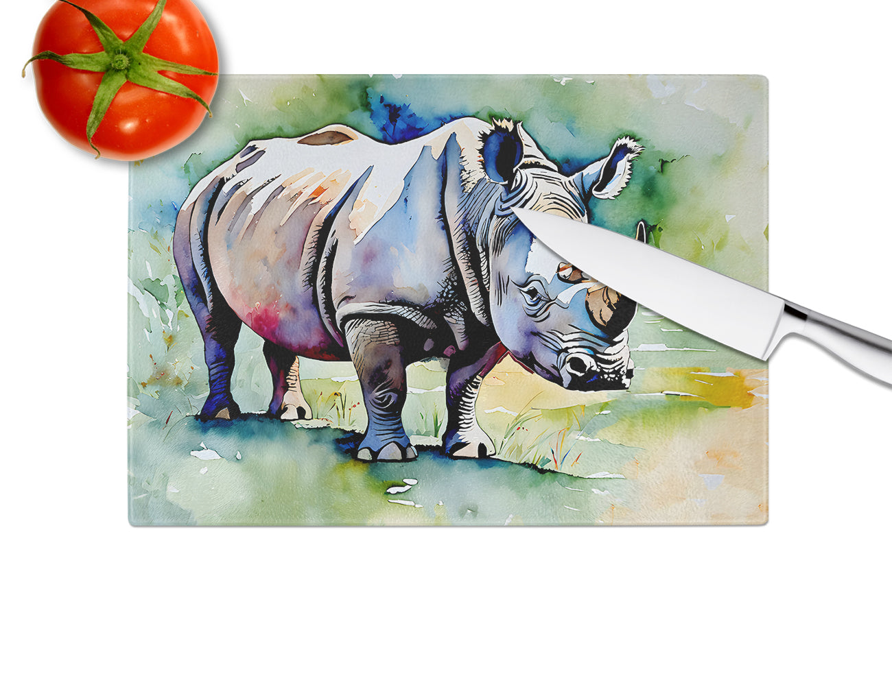 Glass Cutting Board featuring breed specific Rhinoceros artwork. Introduce your kitchen to the vibrant, large Decorative Glass Cutting Board from Caroline's Treasures. Crafted from resilient tempered glass, this board is not only a utilitarian necessity but also a colorful art piece. With its generous dimensions of 15 inches in height and 12 inches in length, it offers ample space for all your cutting needs. Every piece showcases captivating artwork from distinguished artists, bringing an aesthetic edge to your kitchen. Beyond its attractive design, this cutting board ensures your countertop stays pristine and unscathed, owing to its heat-resistant properties. Engineered with user convenience in mind, it features non-skid feet for stability, and rounded corners for additional safety. Its robust construction renders it virtually unbreakable, guaranteeing longevity. The board comes with protective feet bumpers, maintaining its position during use. This product is recommended to be hand washed only. Proudly printed and assembled in the United States, this cutting board exemplifies superior craftsmanship. With Caroline's Treasures' Decorative Glass Cutting Board, you're investing in a blend of functionality and artistic flair.