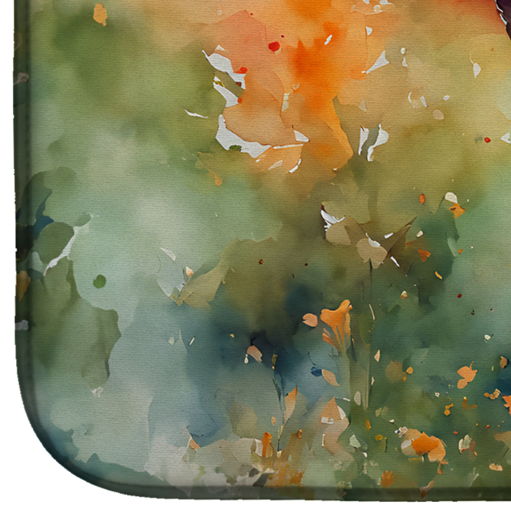 Dish Drying Mat featuring breed specific Deer Stag artwork. Say goodbye to messy countertops and soggy dish towels with our innovative dish drying mat. Our high-quality dish drying pad is designed to keep your countertops dry while offering a stylish and efficient solution. Whether you're air drying dishes, glasses, stemware, silverware, pots, pans, bottles, or even fruits and vegetables, our dish mat is the perfect choice. The 14 inches x 22 inches size fits most counters and dish drying racks, and the non-slip design ensures stability. Made with water-absorbent polyester and a polyurethane foam insert, our dish drying mat is not only functional but also durable. It's machine washable and printed in the USA for long-lasting use. The beautiful artwork adds flair to your kitchen decor, making it a perfect housewarming gift or present for any occasion. Upgrade your kitchen experience with our absorbent and versatile dish drying mat.