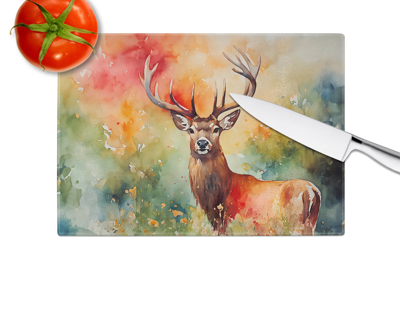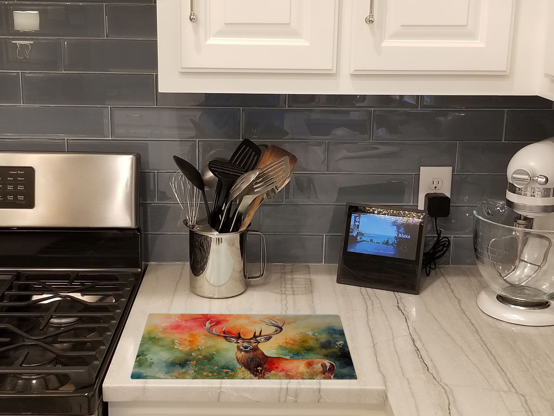 Glass Cutting Board featuring breed specific Deer Stag artwork. Introduce your kitchen to the vibrant, large Decorative Glass Cutting Board from Caroline's Treasures. Crafted from resilient tempered glass, this board is not only a utilitarian necessity but also a colorful art piece. With its generous dimensions of 15 inches in height and 12 inches in length, it offers ample space for all your cutting needs. Every piece showcases captivating artwork from distinguished artists, bringing an aesthetic edge to your kitchen. Beyond its attractive design, this cutting board ensures your countertop stays pristine and unscathed, owing to its heat-resistant properties. Engineered with user convenience in mind, it features non-skid feet for stability, and rounded corners for additional safety. Its robust construction renders it virtually unbreakable, guaranteeing longevity. The board comes with protective feet bumpers, maintaining its position during use. This product is recommended to be hand washed only. Proudly printed and assembled in the United States, this cutting board exemplifies superior craftsmanship. With Caroline's Treasures' Decorative Glass Cutting Board, you're investing in a blend of functionality and artistic flair.
