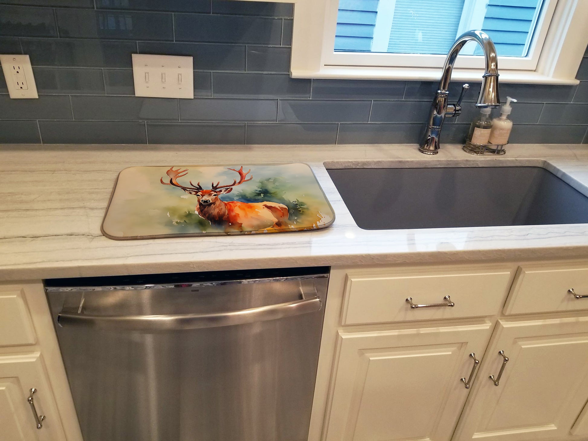 Dish Drying Mat featuring breed specific Deer Stag artwork. Say goodbye to messy countertops and soggy dish towels with our innovative dish drying mat. Our high-quality dish drying pad is designed to keep your countertops dry while offering a stylish and efficient solution. Whether you're air drying dishes, glasses, stemware, silverware, pots, pans, bottles, or even fruits and vegetables, our dish mat is the perfect choice. The 14 inches x 22 inches size fits most counters and dish drying racks, and the non-slip design ensures stability. Made with water-absorbent polyester and a polyurethane foam insert, our dish drying mat is not only functional but also durable. It's machine washable and printed in the USA for long-lasting use. The beautiful artwork adds flair to your kitchen decor, making it a perfect housewarming gift or present for any occasion. Upgrade your kitchen experience with our absorbent and versatile dish drying mat.