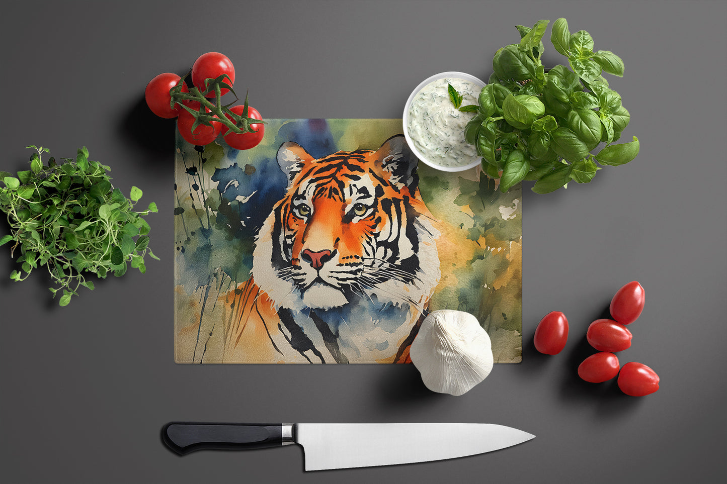 Glass Cutting Board featuring breed specific Tiger artwork. Introduce your kitchen to the vibrant, large Decorative Glass Cutting Board from Caroline's Treasures. Crafted from resilient tempered glass, this board is not only a utilitarian necessity but also a colorful art piece. With its generous dimensions of 15 inches in height and 12 inches in length, it offers ample space for all your cutting needs. Every piece showcases captivating artwork from distinguished artists, bringing an aesthetic edge to your kitchen. Beyond its attractive design, this cutting board ensures your countertop stays pristine and unscathed, owing to its heat-resistant properties. Engineered with user convenience in mind, it features non-skid feet for stability, and rounded corners for additional safety. Its robust construction renders it virtually unbreakable, guaranteeing longevity. The board comes with protective feet bumpers, maintaining its position during use. This product is recommended to be hand washed only. Proudly printed and assembled in the United States, this cutting board exemplifies superior craftsmanship. With Caroline's Treasures' Decorative Glass Cutting Board, you're investing in a blend of functionality and artistic flair.