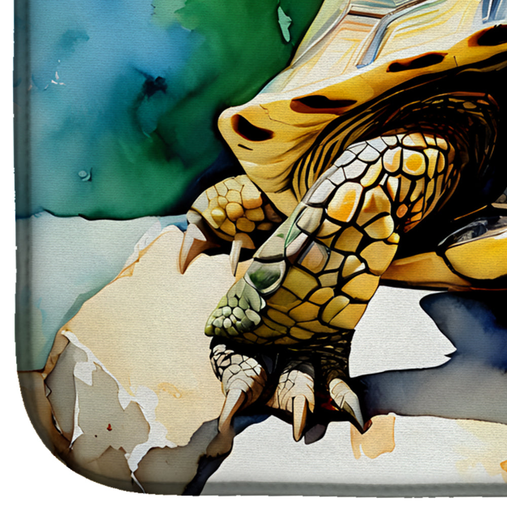 Dish Drying Mat featuring breed specific Tortoises artwork. Say goodbye to messy countertops and soggy dish towels with our innovative dish drying mat. Our high-quality dish drying pad is designed to keep your countertops dry while offering a stylish and efficient solution. Whether you're air drying dishes, glasses, stemware, silverware, pots, pans, bottles, or even fruits and vegetables, our dish mat is the perfect choice. The 14 inches x 22 inches size fits most counters and dish drying racks, and the non-slip design ensures stability. Made with water-absorbent polyester and a polyurethane foam insert, our dish drying mat is not only functional but also durable. It's machine washable and printed in the USA for long-lasting use. The beautiful artwork adds flair to your kitchen decor, making it a perfect housewarming gift or present for any occasion. Upgrade your kitchen experience with our absorbent and versatile dish drying mat.