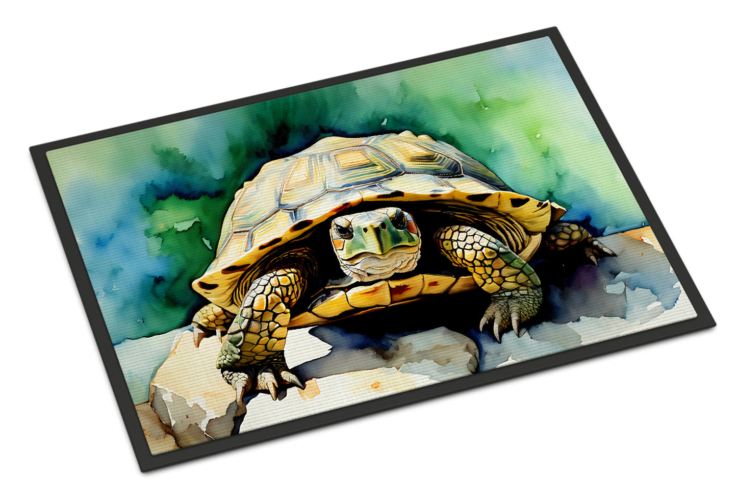 Doormat featuring breed specific Tortoises artwork. Welcome your guests in style with our Artwork Door Mat, designed to withstand almost any weather condition. This mat, measuring approximately 24 by 36 inches, is held together by durable black binding tape. Its top layer, composed of polyester felt, is dyed with the eye-catching image you see on the mat. A few layers below provide the mat with stability, while its rubber bottom is stamped to help prevent slipping and ensures safety. Our mat works wonderfully as both an indoor or outdoor door mat. For cleaning, simply hose it off with water or use a power washer - no need for any cleaner that produces suds. Avoid scrubbing with a brush, instead, opt for the vacuum on floor setting. Designed manufactured and printed in the USA, this mat is a perfect addition to your porch, outdoor kitchen, entryway, or any indoor space. Its unique design makes it a charming decorative rug that greets your guests and adds a stylish touch to your home decor.