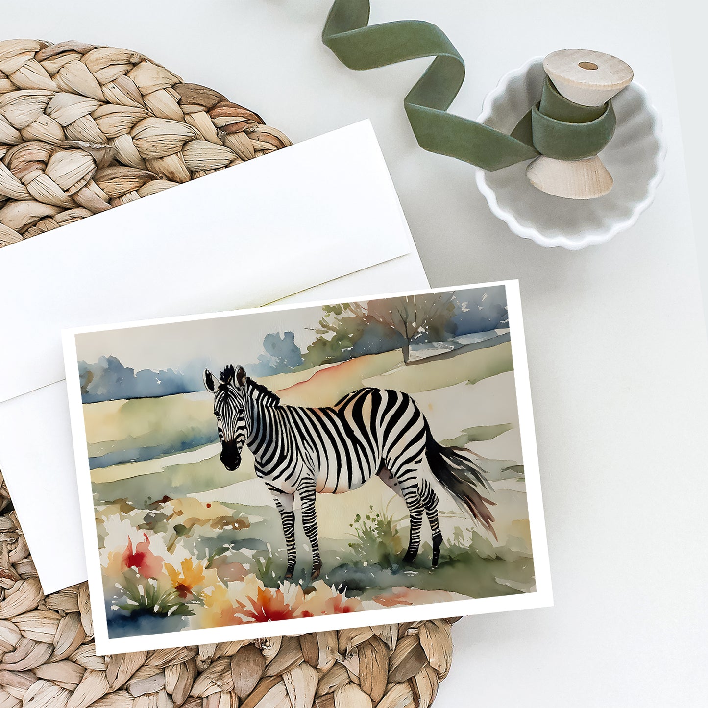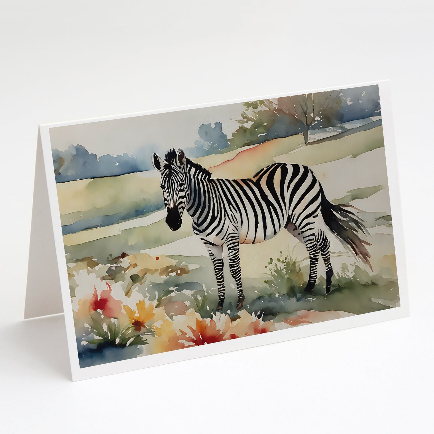 Greeting Cards Pack of 8 featuring breed specific Zebra artwork. Celebrate special moments with Caroline's Treasures Printed Greeting Card Pack. This pack includes eight beautifully folded 5x7 cards, accompanied by eight matching white envelopes. With blank interiors, these cards provide ample space for your personalized messages and heartfelt holiday greetings. Each card features captivating full-color artwork, meticulously printed in our facility on high-quality 80 lb cover stock or 216 GSM. The super smooth finish of the white cards enhances the visual impact of the artwork, creating a truly stunning presentation. Designed by our talented in-house artists or licensed artists, the artwork on these cards showcases their creativity and attention to detail. From vibrant illustrations to captivating designs, each card tells its own unique story. Whether it's for birthdays, anniversaries, holidays, or any special occasion, Caroline's Treasures Greeting Card Pack is the perfect way to convey your heartfelt sentiments. Share joy, love, and warm wishes with these exquisite cards and make every moment unforgettable.