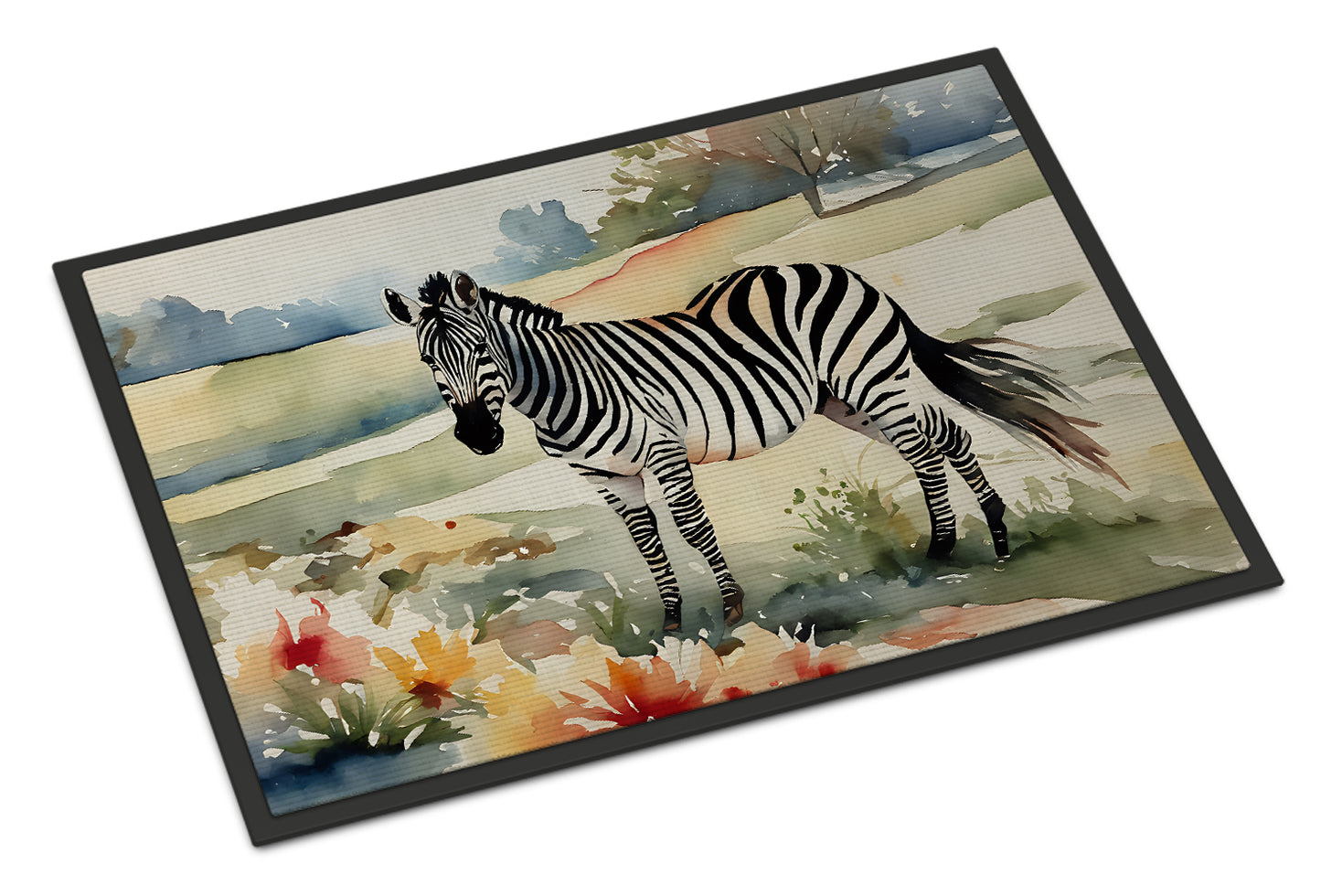 Doormat featuring breed specific Zebra artwork. Welcome your guests in style with our Artwork Door Mat, designed to withstand almost any weather condition. This mat, measuring approximately 18 by 27 inches, is held together by durable black binding tape. Its top layer, composed of polyester felt, is dyed with the eye-catching image you see on the mat. A few layers below provide the mat with stability, while its rubber bottom is stamped to help prevent slipping and ensures safety. Our mat works wonderfully as both an indoor or outdoor door mat. For cleaning, simply hose it off with water or use a power washer - no need for any cleaner that produces suds. Avoid scrubbing with a brush, instead, opt for the vacuum on floor setting. Designed manufactured and printed in the USA, this mat is a perfect addition to your porch, outdoor kitchen, entryway, or any indoor space. Its unique design makes it a charming decorative rug that greets your guests and adds a stylish touch to your home decor.