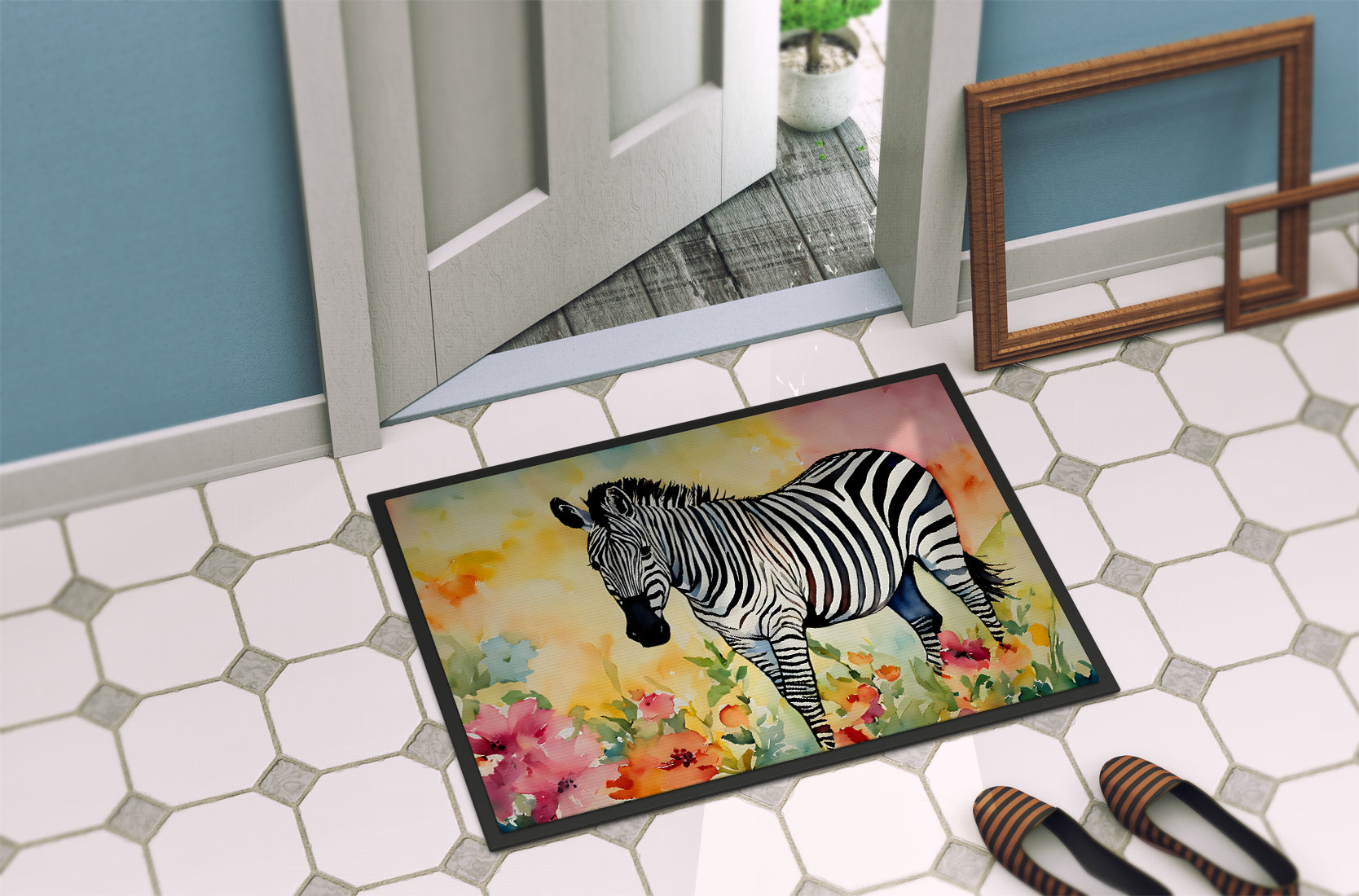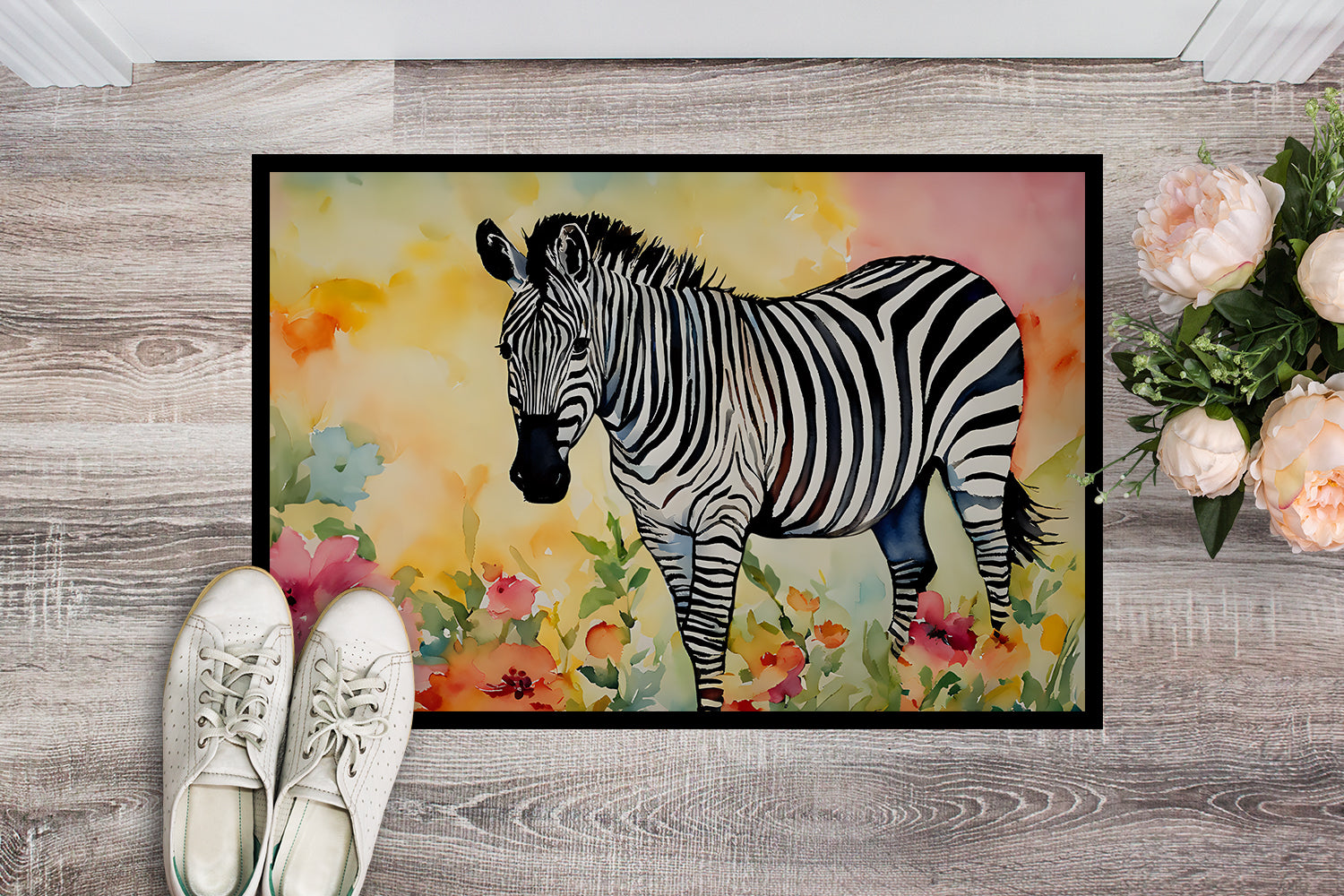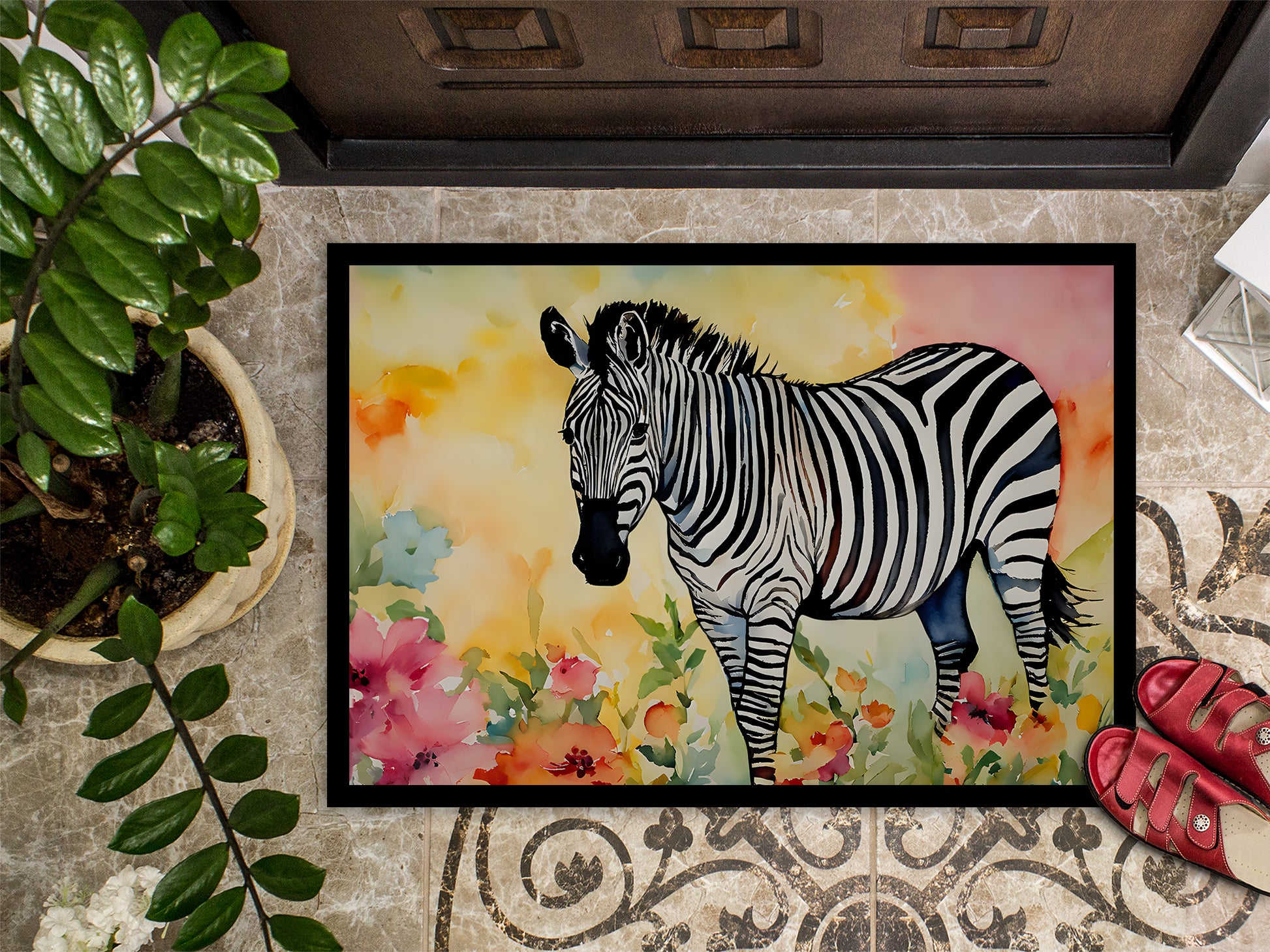Doormat featuring breed specific Zebra artwork. Welcome your guests in style with our Artwork Door Mat, designed to withstand almost any weather condition. This mat, measuring approximately 18 by 27 inches, is held together by durable black binding tape. Its top layer, composed of polyester felt, is dyed with the eye-catching image you see on the mat. A few layers below provide the mat with stability, while its rubber bottom is stamped to help prevent slipping and ensures safety. Our mat works wonderfully as both an indoor or outdoor door mat. For cleaning, simply hose it off with water or use a power washer - no need for any cleaner that produces suds. Avoid scrubbing with a brush, instead, opt for the vacuum on floor setting. Designed manufactured and printed in the USA, this mat is a perfect addition to your porch, outdoor kitchen, entryway, or any indoor space. Its unique design makes it a charming decorative rug that greets your guests and adds a stylish touch to your home decor.