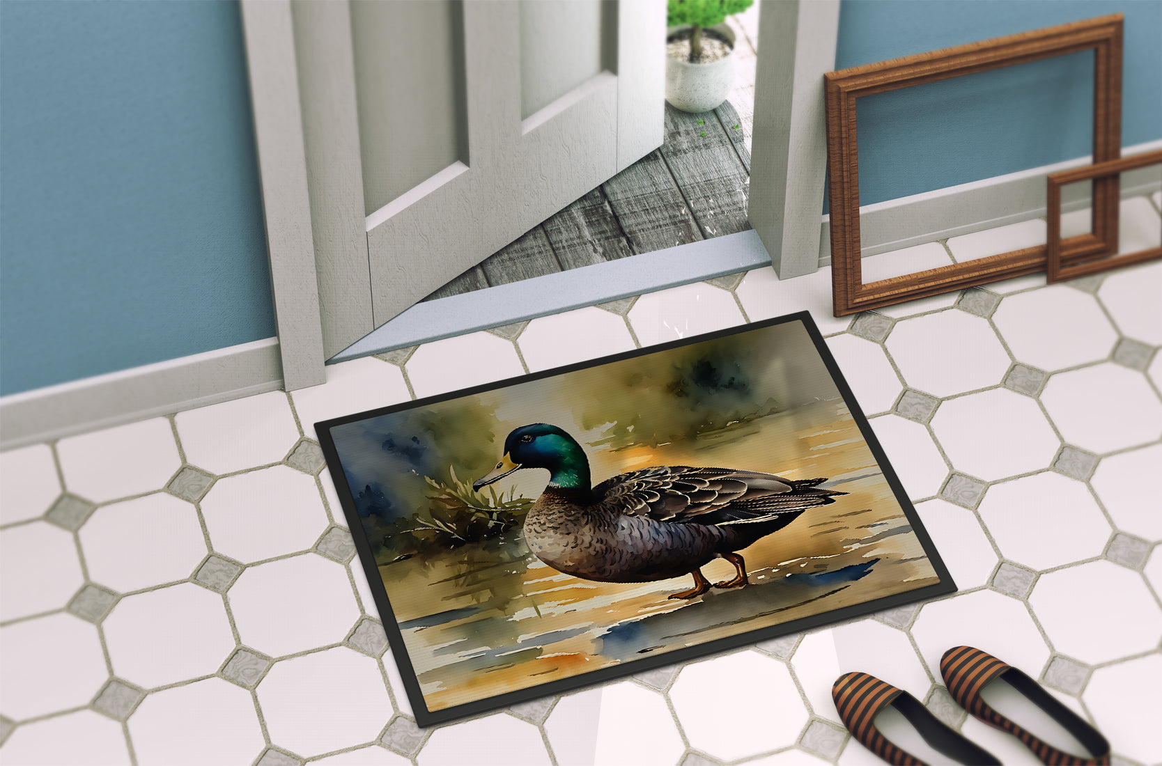 Doormat featuring breed specific American Black Duck artwork. Welcome your guests in style with our Artwork Door Mat, designed to withstand almost any weather condition. This mat, measuring approximately 24 by 36 inches, is held together by durable black binding tape. Its top layer, composed of polyester felt, is dyed with the eye-catching image you see on the mat. A few layers below provide the mat with stability, while its rubber bottom is stamped to help prevent slipping and ensures safety. Our mat works wonderfully as both an indoor or outdoor door mat. For cleaning, simply hose it off with water or use a power washer - no need for any cleaner that produces suds. Avoid scrubbing with a brush, instead, opt for the vacuum on floor setting. Designed manufactured and printed in the USA, this mat is a perfect addition to your porch, outdoor kitchen, entryway, or any indoor space. Its unique design makes it a charming decorative rug that greets your guests and adds a stylish touch to your home decor.