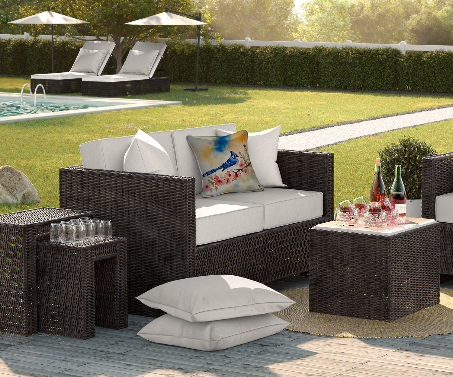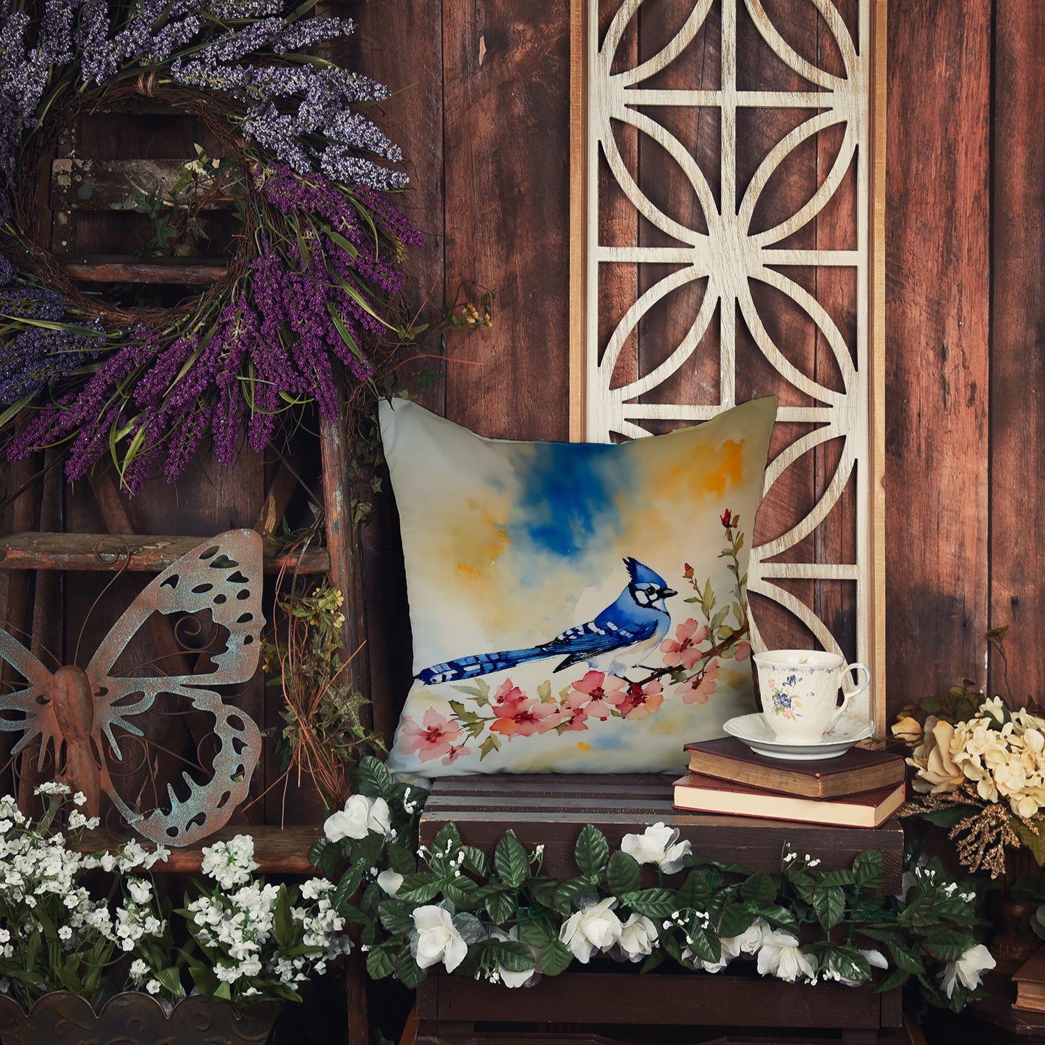 Throw Pillow featuring breed specific Blue Jay artwork. Revitalize your outdoor or indoor living space with Caroline's Treasures 18x18 Fabric Decorative Pillow. With a generously sized dimension of approximately 18 inches by 18 inches, this pillow makes a comfortable and aesthetic addition to any seating area. Made from a unique, water-resistant material developed by Caroline's Treasures, the pillow sham is 100% polyester fabric that's durable and ready to weather any condition. Its vibrant, full-color artwork will not fade over time as it is dyed with color-fast dyes. Whether you place it on your patio furniture, porch, veranda, or indoor couch, its soft canvas fabric ensures a cozy experience. The pillow is handcrafted in the United States, featuring a sham created from three pieces of fabric and a polyester insert for enduring shape and overstuffed comfort. Despite being robustly built to endure the outdoors, it is as soft and snug as your favorite indoor cushions. Please note, as all our pillows are handmade, sizes may vary slightly, adding to the charm of this unique decorative item.