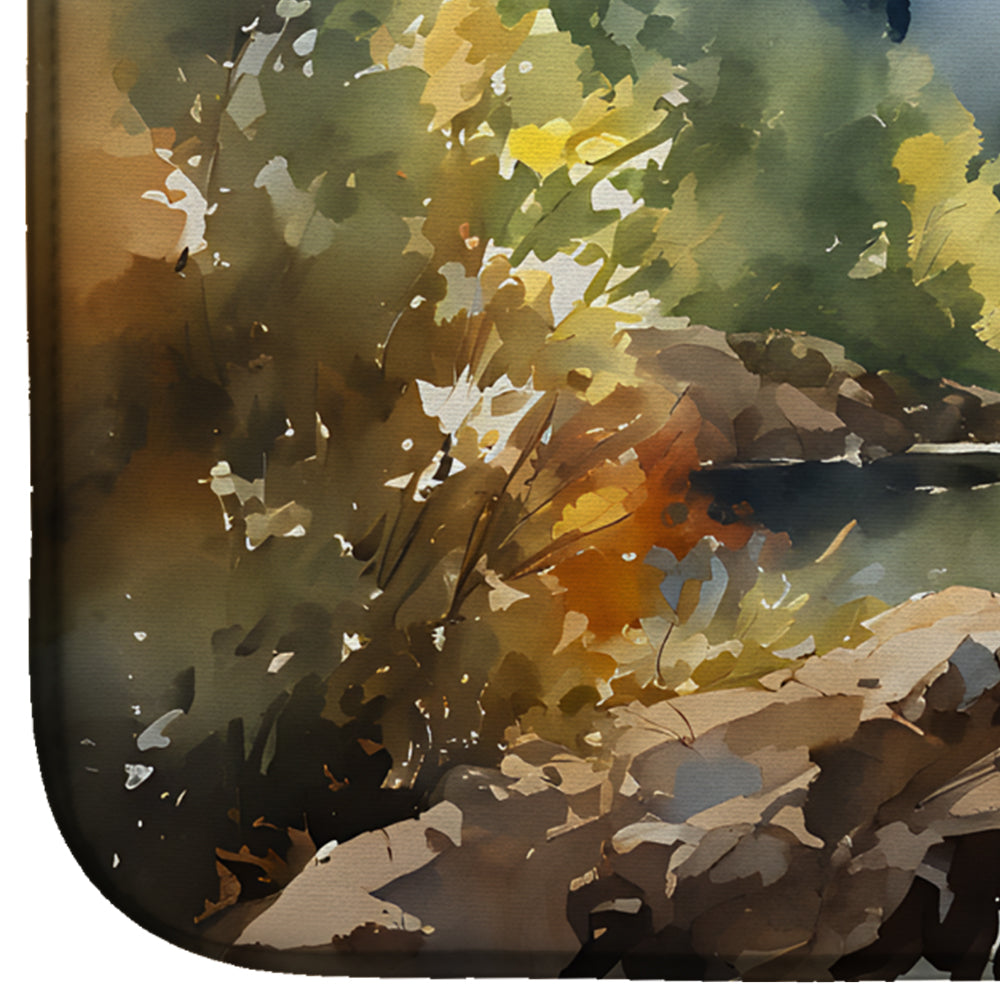 Dish Drying Mat featuring breed specific Eagle artwork. Say goodbye to messy countertops and soggy dish towels with our innovative dish drying mat. Our high-quality dish drying pad is designed to keep your countertops dry while offering a stylish and efficient solution. Whether you're air drying dishes, glasses, stemware, silverware, pots, pans, bottles, or even fruits and vegetables, our dish mat is the perfect choice. The 14 inches x 22 inches size fits most counters and dish drying racks, and the non-slip design ensures stability. Made with water-absorbent polyester and a polyurethane foam insert, our dish drying mat is not only functional but also durable. It's machine washable and printed in the USA for long-lasting use. The beautiful artwork adds flair to your kitchen decor, making it a perfect housewarming gift or present for any occasion. Upgrade your kitchen experience with our absorbent and versatile dish drying mat.