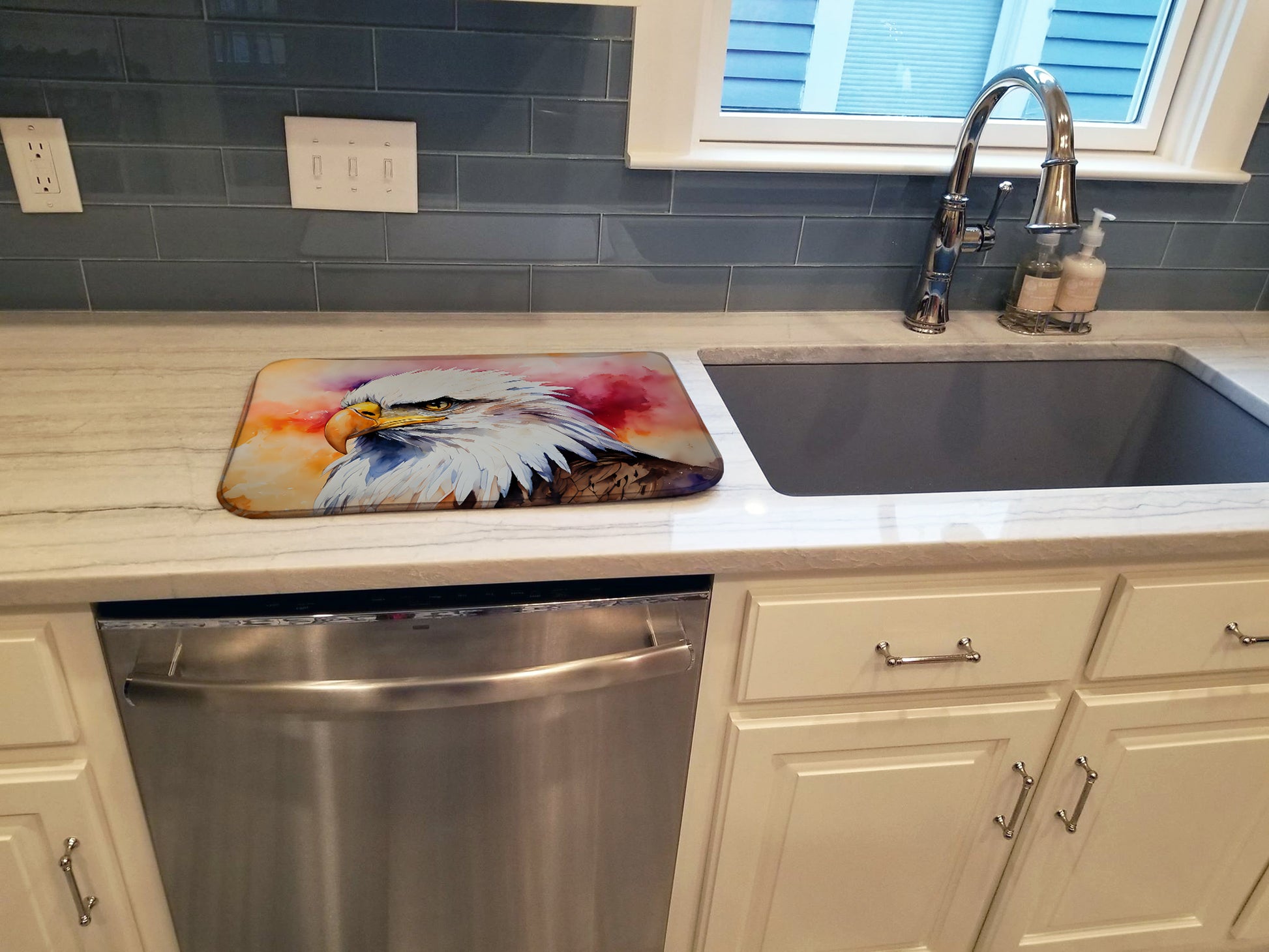 Dish Drying Mat featuring breed specific Eagle artwork. Say goodbye to messy countertops and soggy dish towels with our innovative dish drying mat. Our high-quality dish drying pad is designed to keep your countertops dry while offering a stylish and efficient solution. Whether you're air drying dishes, glasses, stemware, silverware, pots, pans, bottles, or even fruits and vegetables, our dish mat is the perfect choice. The 14 inches x 22 inches size fits most counters and dish drying racks, and the non-slip design ensures stability. Made with water-absorbent polyester and a polyurethane foam insert, our dish drying mat is not only functional but also durable. It's machine washable and printed in the USA for long-lasting use. The beautiful artwork adds flair to your kitchen decor, making it a perfect housewarming gift or present for any occasion. Upgrade your kitchen experience with our absorbent and versatile dish drying mat.