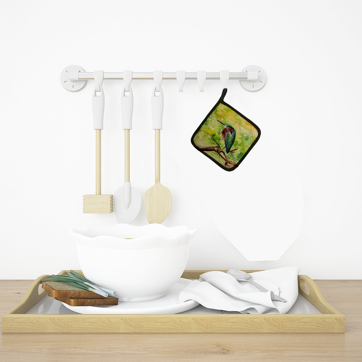 Pair of Pot Holders featuring breed specific Green Heron artwork. A Pair of Pot Holders to match your kitchen decor. Made in the USA these are thick and functional. Full color artwork decorates the front polyester fabric of the hot pad and accented by a black trim. Use these at as a trivet for your Thanksgiving or Christmas tablescape. Filled with insulated fabric and quilted for durability. These colorful pot holders will make a great gift for your favorite home cook or executive chef. Each pot holder measures approximately 7 1/2 inches by 7 1/2 inches. A hanging tab is included.