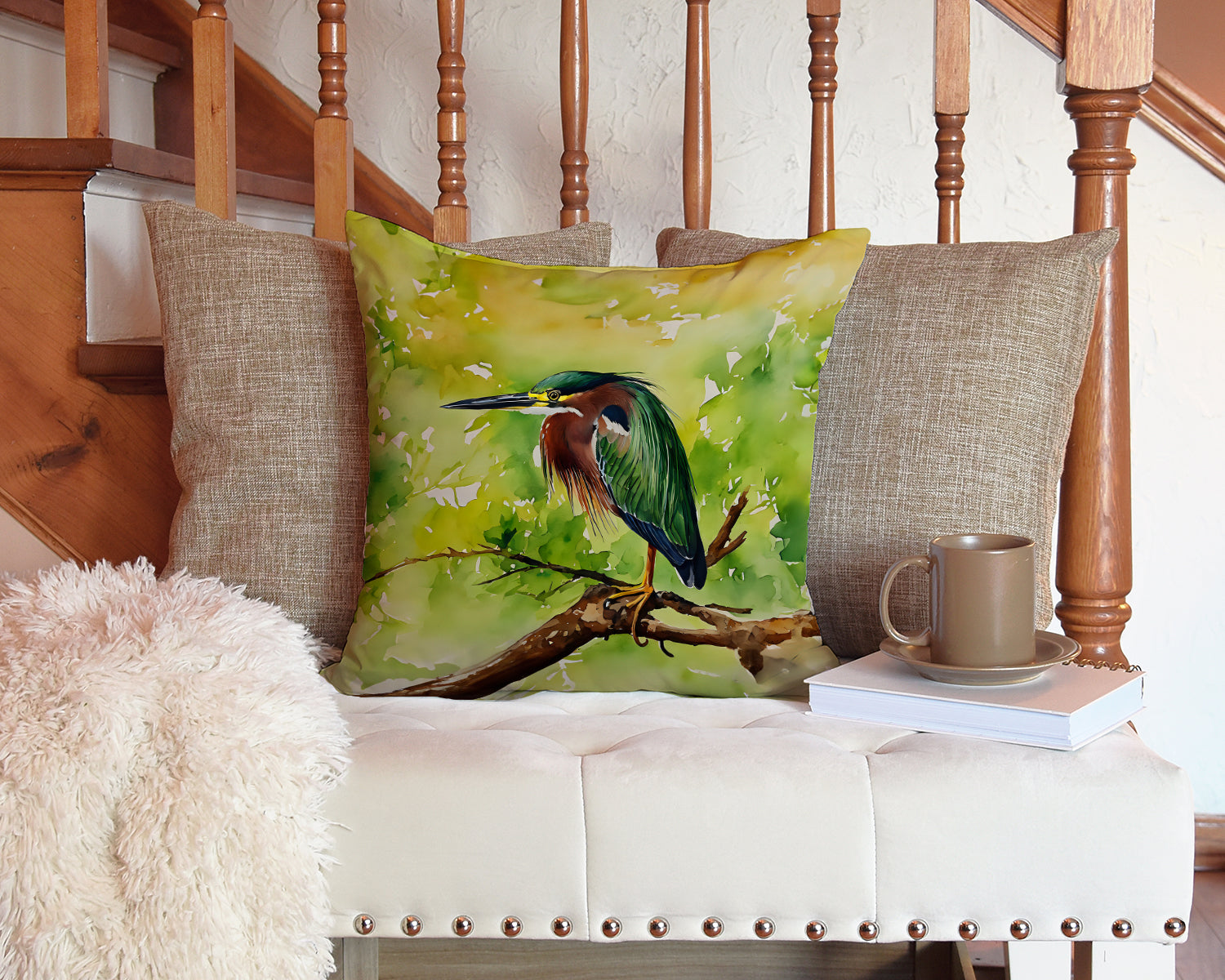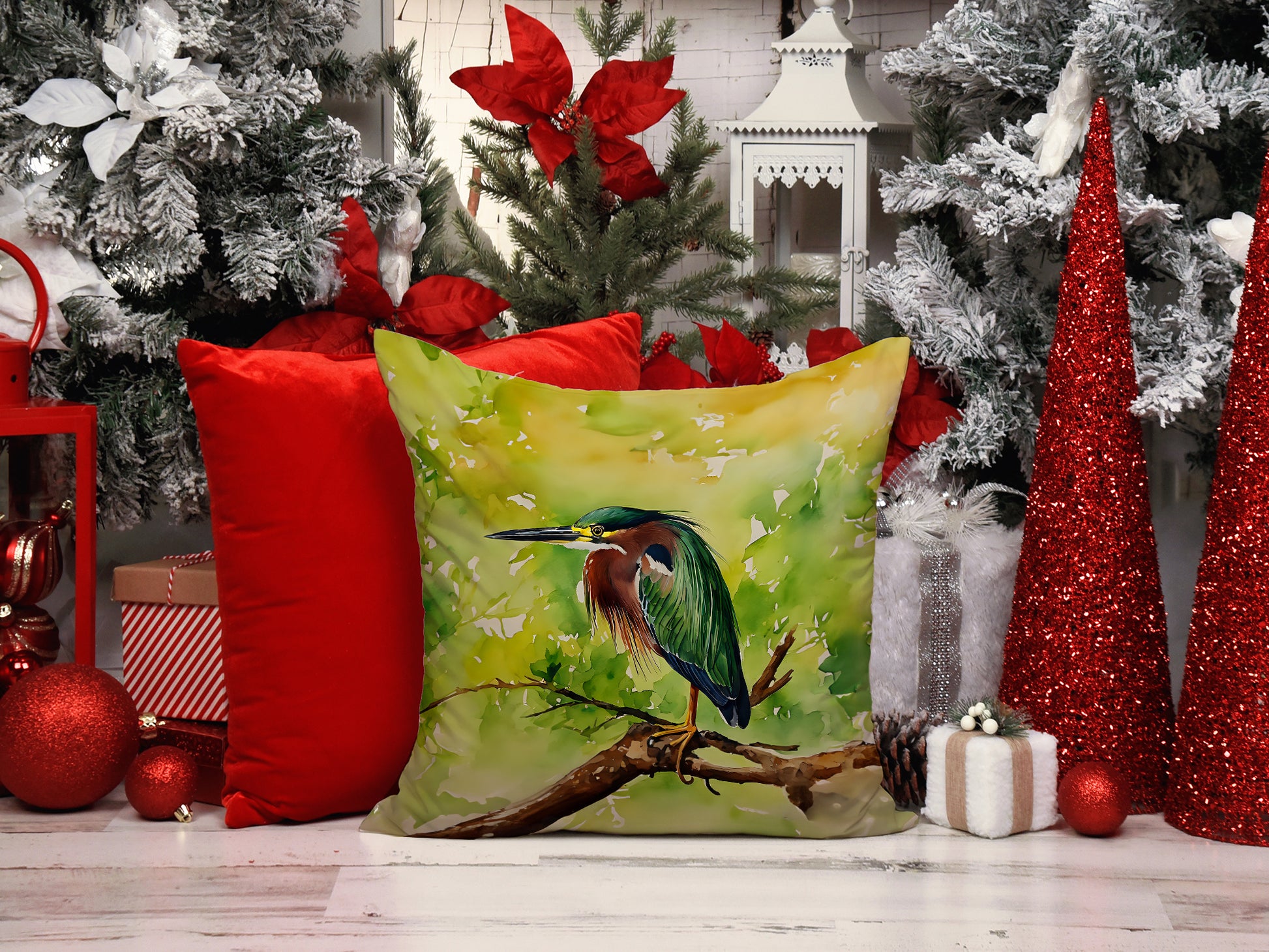 Throw Pillow featuring breed specific Green Heron artwork. Add a touch of vibrancy and comfort to your outdoor seating with Caroline's Treasures Fabric Decorative Pillow. Measuring approximately 14 inches by 14 inches, this outdoor pillow is crafted to elevate the appeal of your patio furniture, infusing it with vivid color and artistic flair. The pillow includes a 100% Polyester Fabric sham filled with a quality pillow form to provide superior comfort. Innovatively made from our brand new material, specifically woven for its water resistance, this pillow is designed for durability. The soft canvas fabric offers versatility in use, fit for your indoor couch or your outdoor patio, porch, or veranda. The fabric is dyed with colorfast dyes built for resilience against weather conditions, ensuring the pillow retains its beauty over time. Constructed by sewing three fabric pieces to create a sham, the polyester insert is then nestled inside to form the pillow, resulting in an overstuffed pillow that maintains its shape. Both the sham and the pillow insert are proudly made in the United States. As the pillows are handcrafted, there may be minor variations in size, further enhancing their unique charm. Experience comfort in style with Caroline's Treasures Fabric Decorative Pillow.