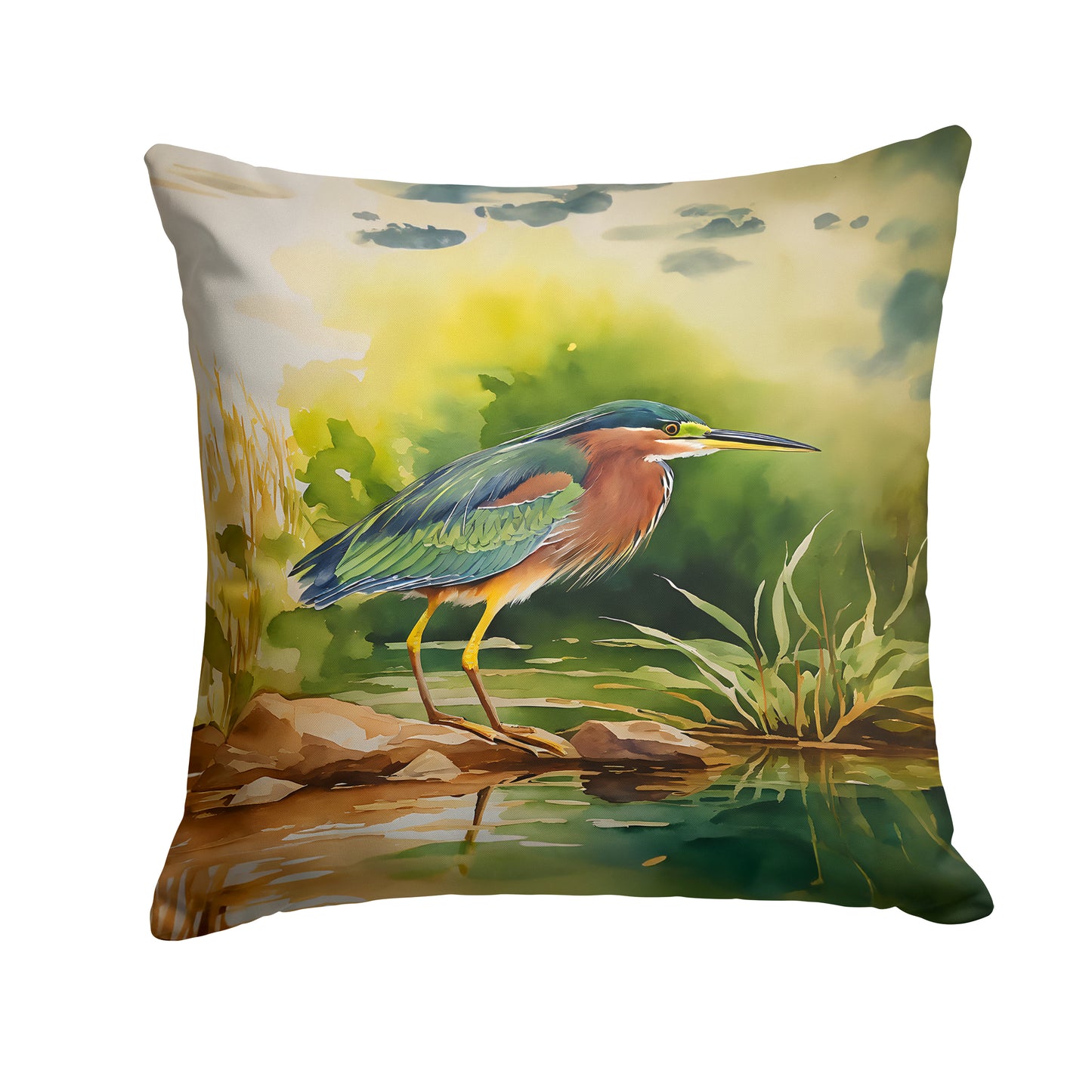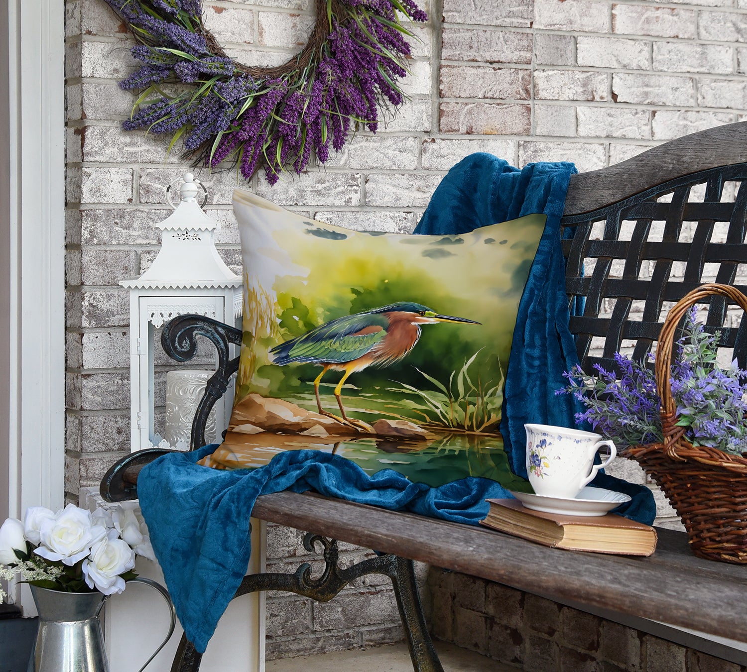 Throw Pillow featuring breed specific Green Heron artwork. Revitalize your outdoor or indoor living space with Caroline's Treasures 18x18 Fabric Decorative Pillow. With a generously sized dimension of approximately 18 inches by 18 inches, this pillow makes a comfortable and aesthetic addition to any seating area. Made from a unique, water-resistant material developed by Caroline's Treasures, the pillow sham is 100% polyester fabric that's durable and ready to weather any condition. Its vibrant, full-color artwork will not fade over time as it is dyed with color-fast dyes. Whether you place it on your patio furniture, porch, veranda, or indoor couch, its soft canvas fabric ensures a cozy experience. The pillow is handcrafted in the United States, featuring a sham created from three pieces of fabric and a polyester insert for enduring shape and overstuffed comfort. Despite being robustly built to endure the outdoors, it is as soft and snug as your favorite indoor cushions. Please note, as all our pillows are handmade, sizes may vary slightly, adding to the charm of this unique decorative item.
