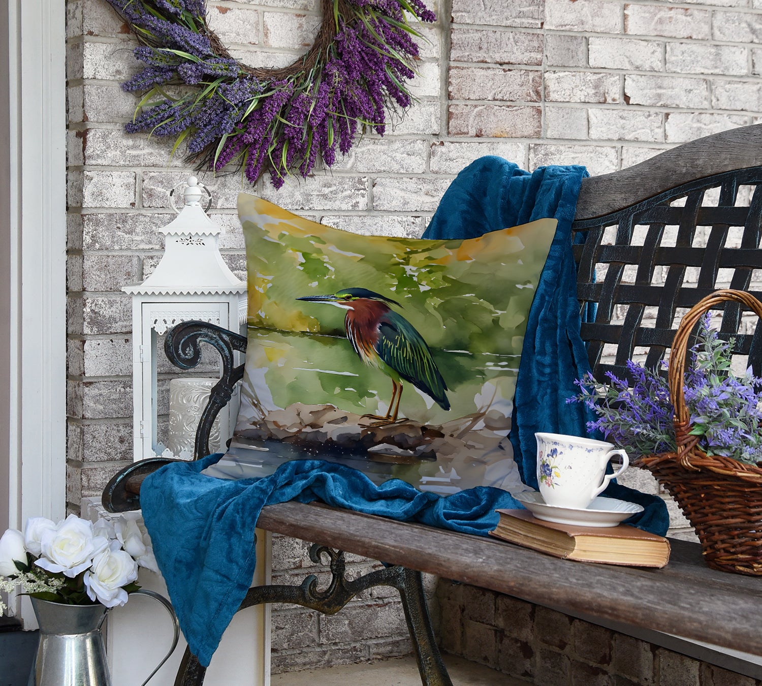 Throw Pillow featuring breed specific Green Heron artwork. Revitalize your outdoor or indoor living space with Caroline's Treasures 18x18 Fabric Decorative Pillow. With a generously sized dimension of approximately 18 inches by 18 inches, this pillow makes a comfortable and aesthetic addition to any seating area. Made from a unique, water-resistant material developed by Caroline's Treasures, the pillow sham is 100% polyester fabric that's durable and ready to weather any condition. Its vibrant, full-color artwork will not fade over time as it is dyed with color-fast dyes. Whether you place it on your patio furniture, porch, veranda, or indoor couch, its soft canvas fabric ensures a cozy experience. The pillow is handcrafted in the United States, featuring a sham created from three pieces of fabric and a polyester insert for enduring shape and overstuffed comfort. Despite being robustly built to endure the outdoors, it is as soft and snug as your favorite indoor cushions. Please note, as all our pillows are handmade, sizes may vary slightly, adding to the charm of this unique decorative item.