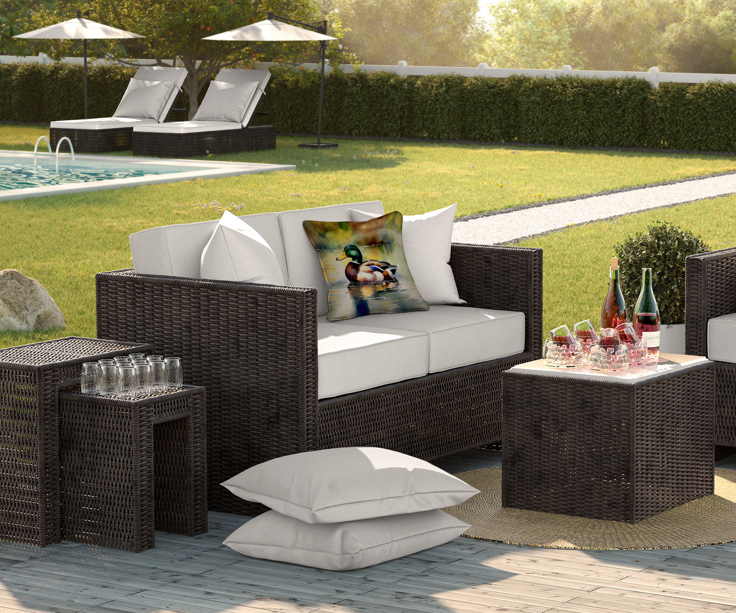 Throw Pillow featuring breed specific Mallard artwork. Revitalize your outdoor or indoor living space with Caroline's Treasures 18x18 Fabric Decorative Pillow. With a generously sized dimension of approximately 18 inches by 18 inches, this pillow makes a comfortable and aesthetic addition to any seating area. Made from a unique, water-resistant material developed by Caroline's Treasures, the pillow sham is 100% polyester fabric that's durable and ready to weather any condition. Its vibrant, full-color artwork will not fade over time as it is dyed with color-fast dyes. Whether you place it on your patio furniture, porch, veranda, or indoor couch, its soft canvas fabric ensures a cozy experience. The pillow is handcrafted in the United States, featuring a sham created from three pieces of fabric and a polyester insert for enduring shape and overstuffed comfort. Despite being robustly built to endure the outdoors, it is as soft and snug as your favorite indoor cushions. Please note, as all our pillows are handmade, sizes may vary slightly, adding to the charm of this unique decorative item.
