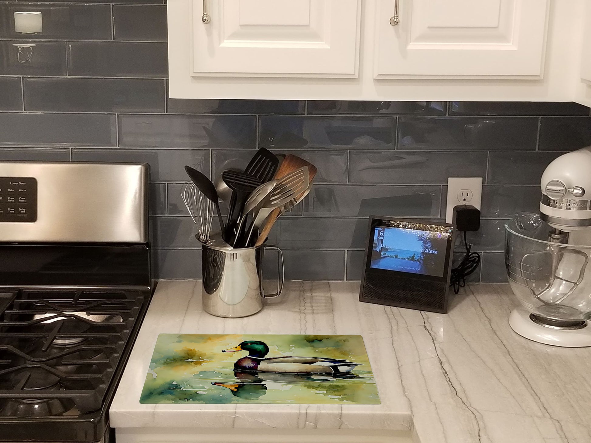 Glass Cutting Board featuring breed specific Mallard artwork. Introduce your kitchen to the vibrant, large Decorative Glass Cutting Board from Caroline's Treasures. Crafted from resilient tempered glass, this board is not only a utilitarian necessity but also a colorful art piece. With its generous dimensions of 15 inches in height and 12 inches in length, it offers ample space for all your cutting needs. Every piece showcases captivating artwork from distinguished artists, bringing an aesthetic edge to your kitchen. Beyond its attractive design, this cutting board ensures your countertop stays pristine and unscathed, owing to its heat-resistant properties. Engineered with user convenience in mind, it features non-skid feet for stability, and rounded corners for additional safety. Its robust construction renders it virtually unbreakable, guaranteeing longevity. The board comes with protective feet bumpers, maintaining its position during use. This product is recommended to be hand washed only. Proudly printed and assembled in the United States, this cutting board exemplifies superior craftsmanship. With Caroline's Treasures' Decorative Glass Cutting Board, you're investing in a blend of functionality and artistic flair.