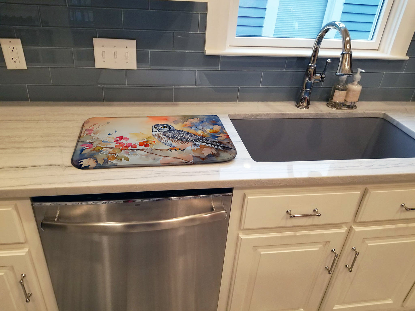 Dish Drying Mat featuring breed specific Northern Hawk Owl artwork. Say goodbye to messy countertops and soggy dish towels with our innovative dish drying mat. Our high-quality dish drying pad is designed to keep your countertops dry while offering a stylish and efficient solution. Whether you're air drying dishes, glasses, stemware, silverware, pots, pans, bottles, or even fruits and vegetables, our dish mat is the perfect choice. The 14 inches x 22 inches size fits most counters and dish drying racks, and the non-slip design ensures stability. Made with water-absorbent polyester and a polyurethane foam insert, our dish drying mat is not only functional but also durable. It's machine washable and printed in the USA for long-lasting use. The beautiful artwork adds flair to your kitchen decor, making it a perfect housewarming gift or present for any occasion. Upgrade your kitchen experience with our absorbent and versatile dish drying mat.