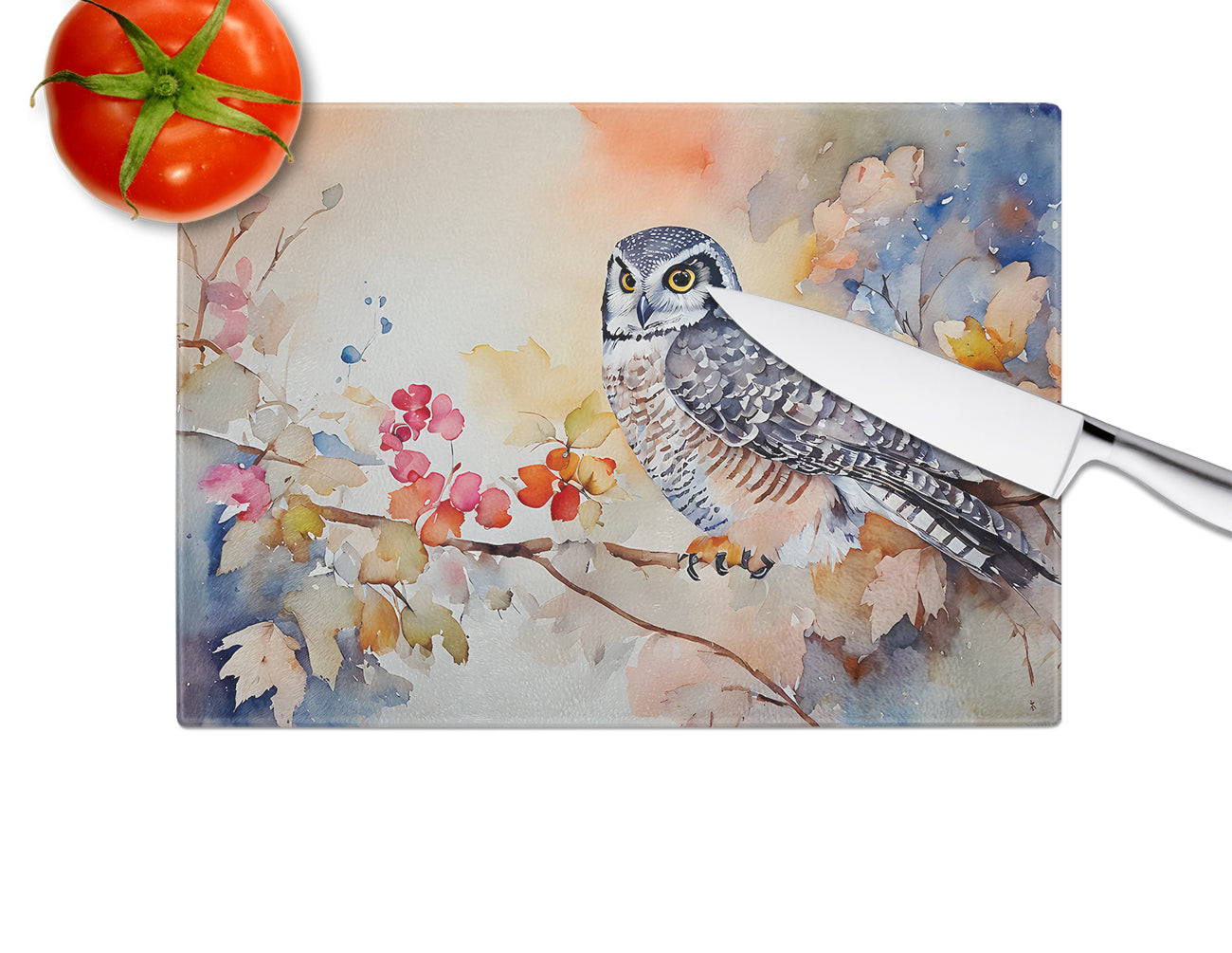 Glass Cutting Board featuring breed specific Northern Hawk Owl artwork. Introduce your kitchen to the vibrant, large Decorative Glass Cutting Board from Caroline's Treasures. Crafted from resilient tempered glass, this board is not only a utilitarian necessity but also a colorful art piece. With its generous dimensions of 15 inches in height and 12 inches in length, it offers ample space for all your cutting needs. Every piece showcases captivating artwork from distinguished artists, bringing an aesthetic edge to your kitchen. Beyond its attractive design, this cutting board ensures your countertop stays pristine and unscathed, owing to its heat-resistant properties. Engineered with user convenience in mind, it features non-skid feet for stability, and rounded corners for additional safety. Its robust construction renders it virtually unbreakable, guaranteeing longevity. The board comes with protective feet bumpers, maintaining its position during use. This product is recommended to be hand washed only. Proudly printed and assembled in the United States, this cutting board exemplifies superior craftsmanship. With Caroline's Treasures' Decorative Glass Cutting Board, you're investing in a blend of functionality and artistic flair.