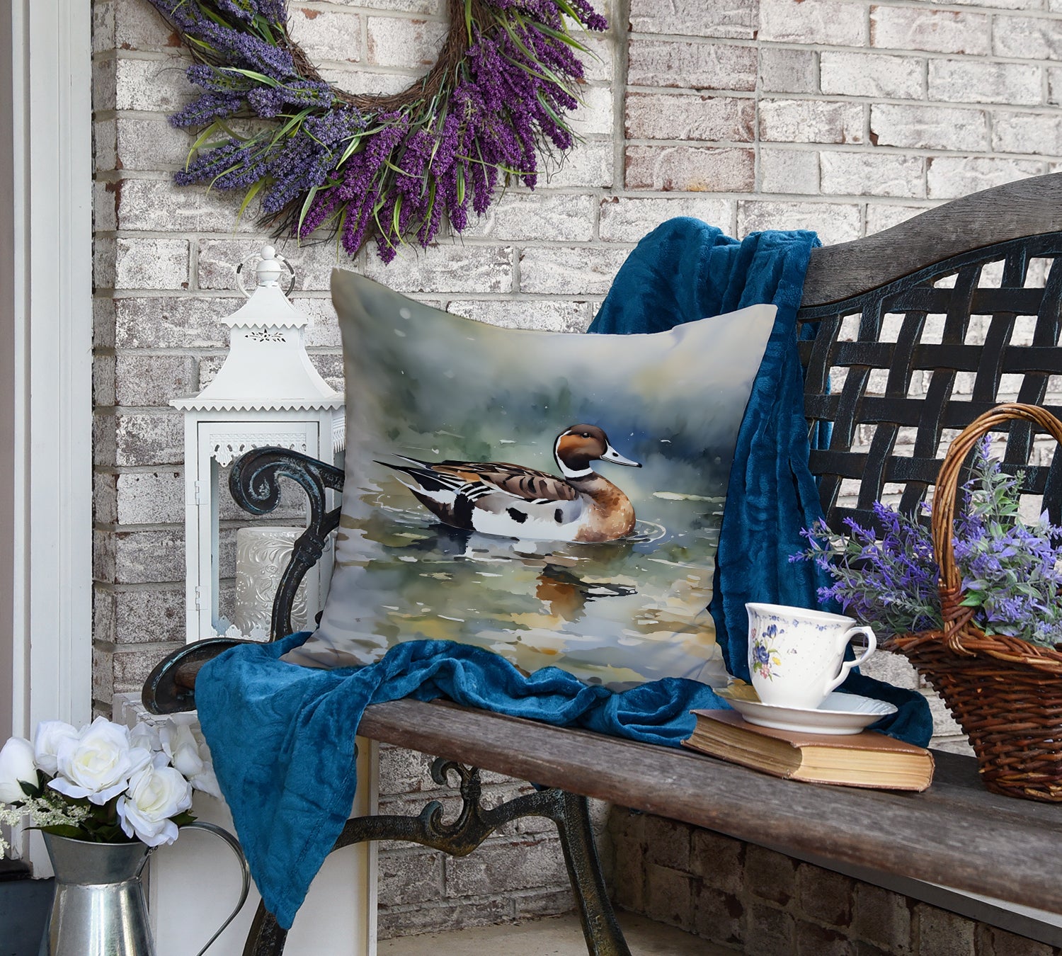 Throw Pillow featuring breed specific Northern Pintail artwork. Revitalize your outdoor or indoor living space with Caroline's Treasures 18x18 Fabric Decorative Pillow. With a generously sized dimension of approximately 18 inches by 18 inches, this pillow makes a comfortable and aesthetic addition to any seating area. Made from a unique, water-resistant material developed by Caroline's Treasures, the pillow sham is 100% polyester fabric that's durable and ready to weather any condition. Its vibrant, full-color artwork will not fade over time as it is dyed with color-fast dyes. Whether you place it on your patio furniture, porch, veranda, or indoor couch, its soft canvas fabric ensures a cozy experience. The pillow is handcrafted in the United States, featuring a sham created from three pieces of fabric and a polyester insert for enduring shape and overstuffed comfort. Despite being robustly built to endure the outdoors, it is as soft and snug as your favorite indoor cushions. Please note, as all our pillows are handmade, sizes may vary slightly, adding to the charm of this unique decorative item.