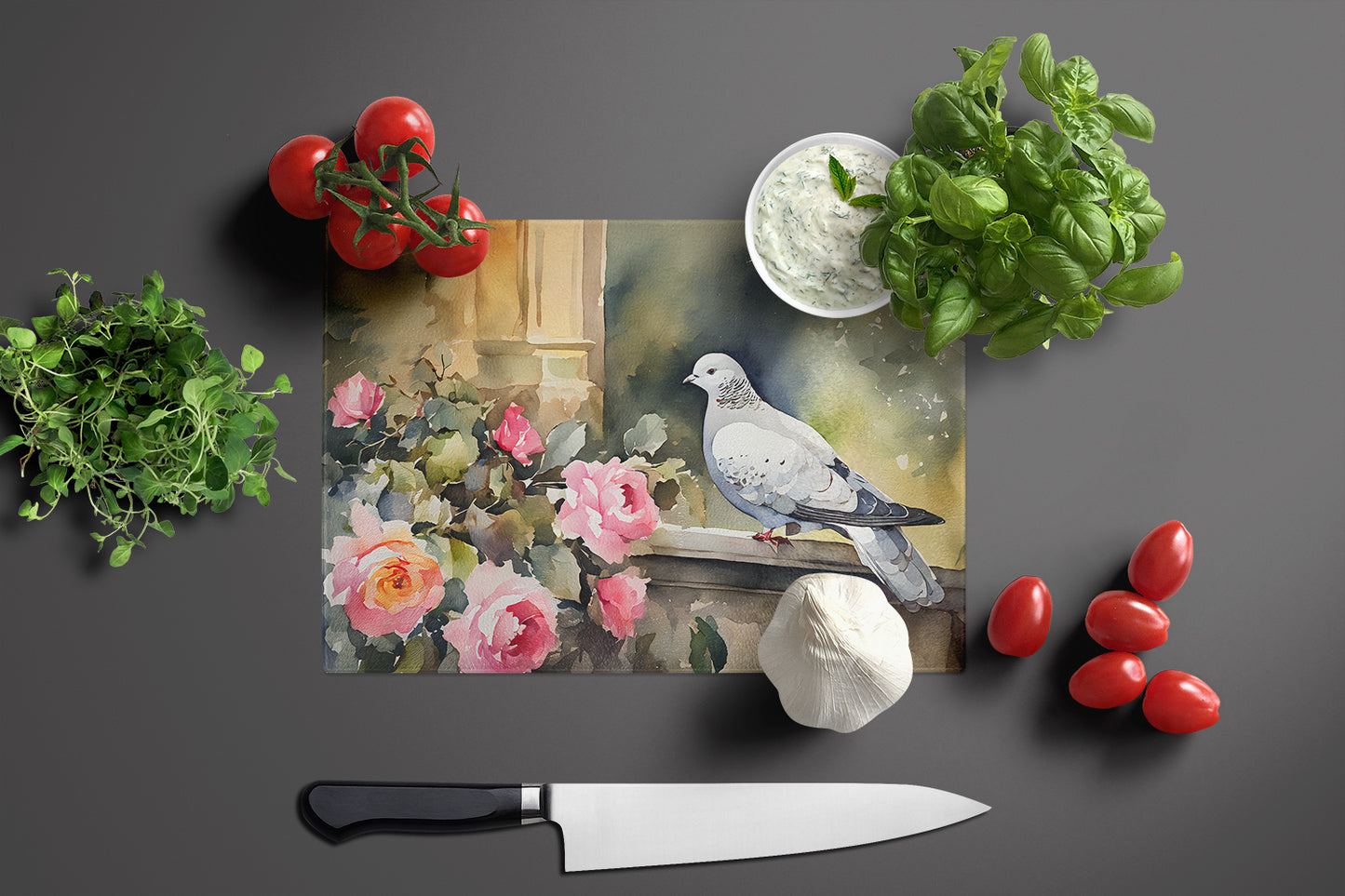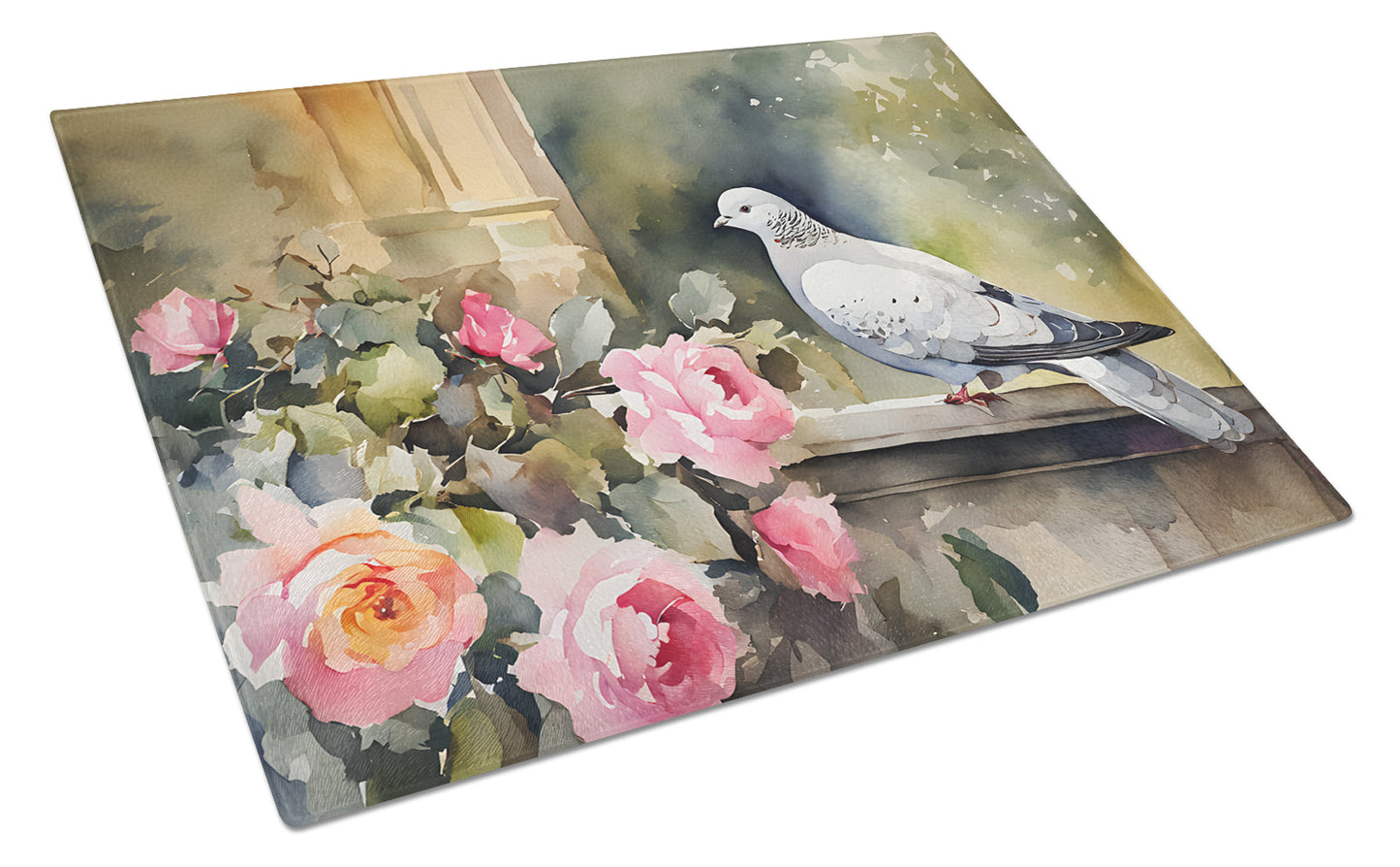 Glass Cutting Board featuring breed specific Pigeon artwork. Introduce your kitchen to the vibrant, large Decorative Glass Cutting Board from Caroline's Treasures. Crafted from resilient tempered glass, this board is not only a utilitarian necessity but also a colorful art piece. With its generous dimensions of 15 inches in height and 12 inches in length, it offers ample space for all your cutting needs. Every piece showcases captivating artwork from distinguished artists, bringing an aesthetic edge to your kitchen. Beyond its attractive design, this cutting board ensures your countertop stays pristine and unscathed, owing to its heat-resistant properties. Engineered with user convenience in mind, it features non-skid feet for stability, and rounded corners for additional safety. Its robust construction renders it virtually unbreakable, guaranteeing longevity. The board comes with protective feet bumpers, maintaining its position during use. This product is recommended to be hand washed only. Proudly printed and assembled in the United States, this cutting board exemplifies superior craftsmanship. With Caroline's Treasures' Decorative Glass Cutting Board, you're investing in a blend of functionality and artistic flair.