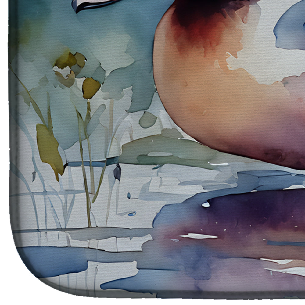 Dish Drying Mat featuring breed specific Redhead Duck artwork. Say goodbye to messy countertops and soggy dish towels with our innovative dish drying mat. Our high-quality dish drying pad is designed to keep your countertops dry while offering a stylish and efficient solution. Whether you're air drying dishes, glasses, stemware, silverware, pots, pans, bottles, or even fruits and vegetables, our dish mat is the perfect choice. The 14 inches x 22 inches size fits most counters and dish drying racks, and the non-slip design ensures stability. Made with water-absorbent polyester and a polyurethane foam insert, our dish drying mat is not only functional but also durable. It's machine washable and printed in the USA for long-lasting use. The beautiful artwork adds flair to your kitchen decor, making it a perfect housewarming gift or present for any occasion. Upgrade your kitchen experience with our absorbent and versatile dish drying mat.