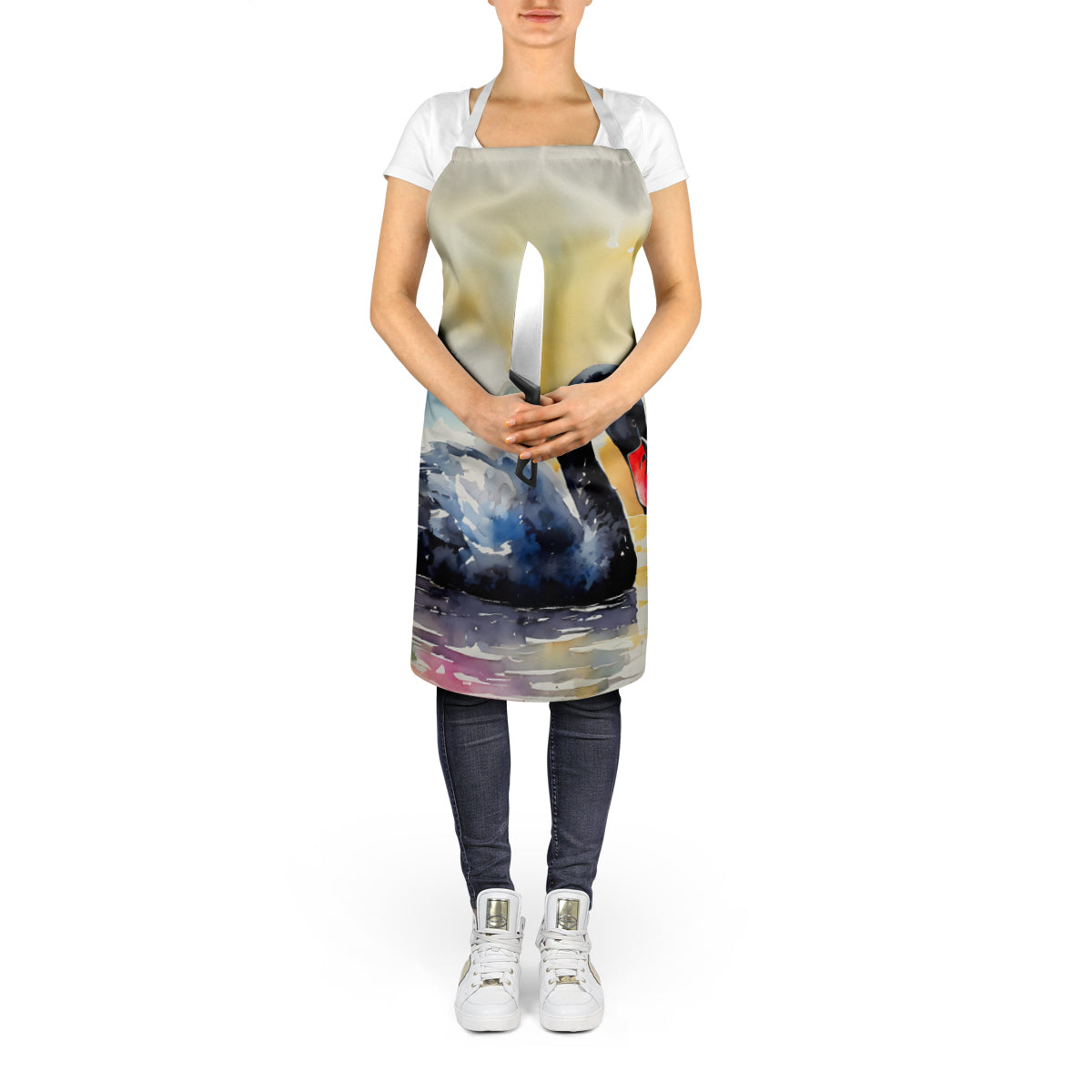 Apron featuring breed specific Black Swan artwork. Elevate your cooking, baking, and grilling experiences with our versatile Kitchen or BBQ Apron. This Bib Style apron isn't just limited to culinary activities - it also serves as an excellent baking apron, artist apron, server apron, gardening apron, or even a dog grooming apron. The apron showcases vibrant full-color artwork contributed by one of our talented artists, bringing a dash of style to your daily tasks. With dimensions of approximately 27"W x 30"H, it provides ample coverage to protect your clothing from spills and splashes. Our apron is meticulously crafted from 100% Ultra Spun Polyester, known for its durability and lightweight nature. The apron comes with white tie straps, ensuring a comfortable and adjustable fit for all. It's a perfect choice for kitchen apron enthusiasts, whether you are a woman or a man. Designed for easy maintenance, this apron is fully machine washable. The quick-drying polyester material actively reduces staining, keeping your apron looking fresh and new for longer. Our beautifully designed apron isn't just a functional kitchen accessory - it's a fashion statement in the culinary world!