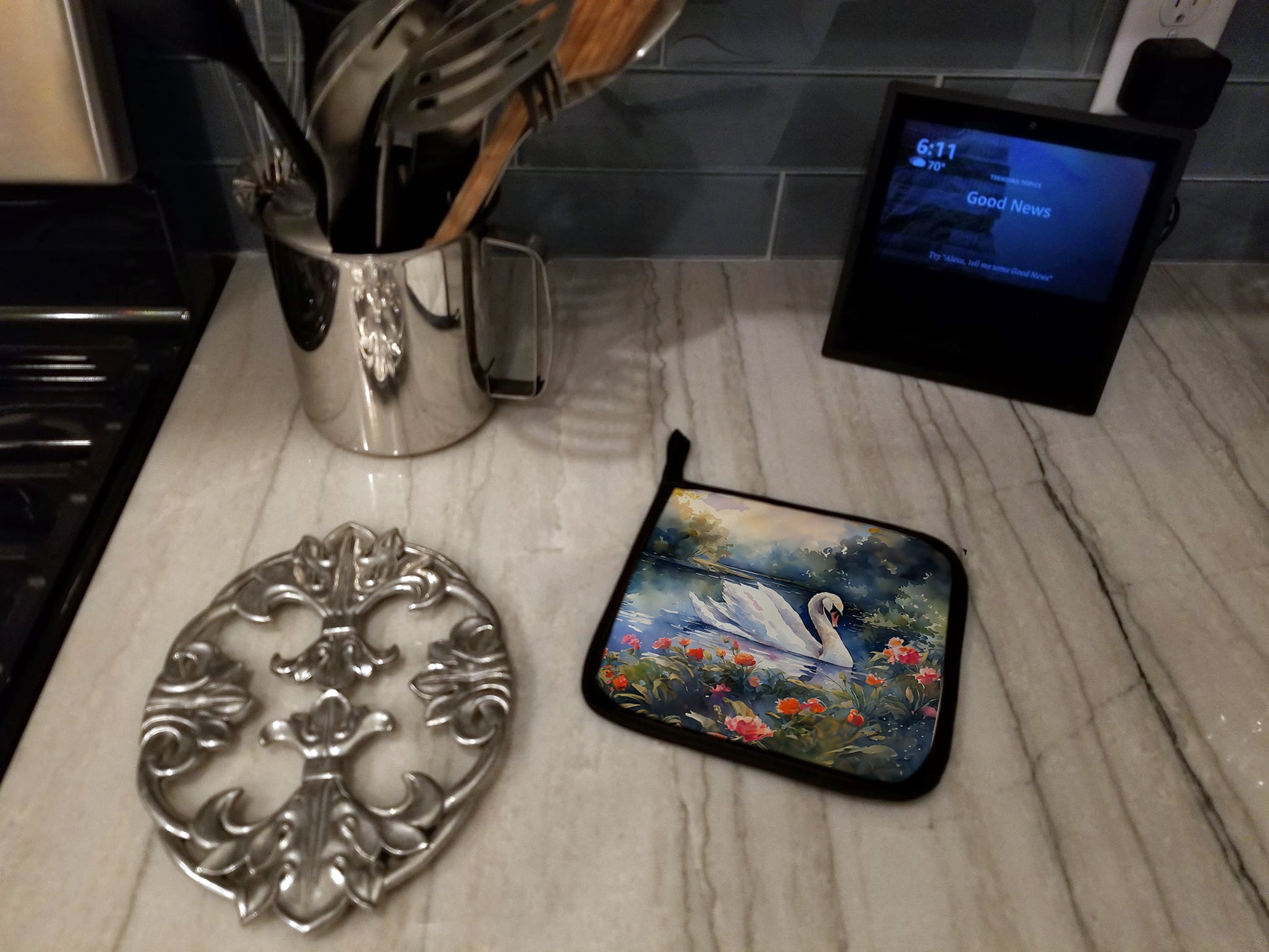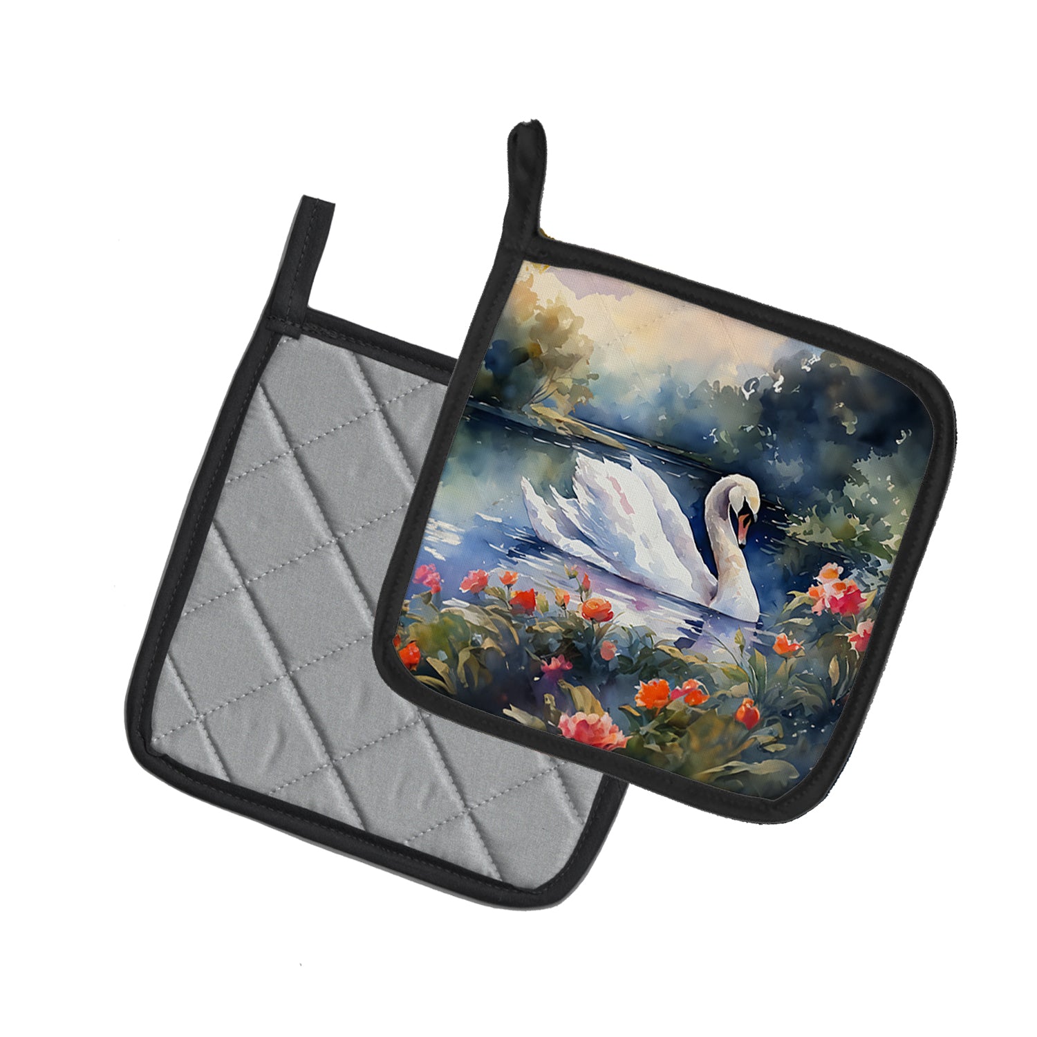 Pair of Pot Holders featuring breed specific Swan artwork. A Pair of Pot Holders to match your kitchen decor. Made in the USA these are thick and functional. Full color artwork decorates the front polyester fabric of the hot pad and accented by a black trim. Use these at as a trivet for your Thanksgiving or Christmas tablescape. Filled with insulated fabric and quilted for durability. These colorful pot holders will make a great gift for your favorite home cook or executive chef. Each pot holder measures approximately 7 1/2 inches by 7 1/2 inches. A hanging tab is included.