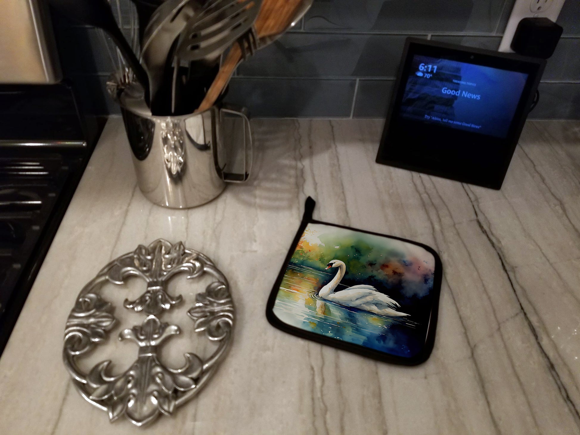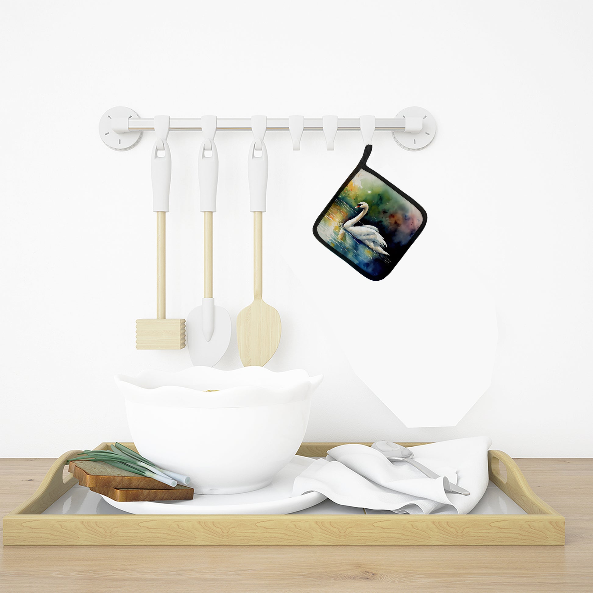 Pair of Pot Holders featuring breed specific Swan artwork. A Pair of Pot Holders to match your kitchen decor. Made in the USA these are thick and functional. Full color artwork decorates the front polyester fabric of the hot pad and accented by a black trim. Use these at as a trivet for your Thanksgiving or Christmas tablescape. Filled with insulated fabric and quilted for durability. These colorful pot holders will make a great gift for your favorite home cook or executive chef. Each pot holder measures approximately 7 1/2 inches by 7 1/2 inches. A hanging tab is included.
