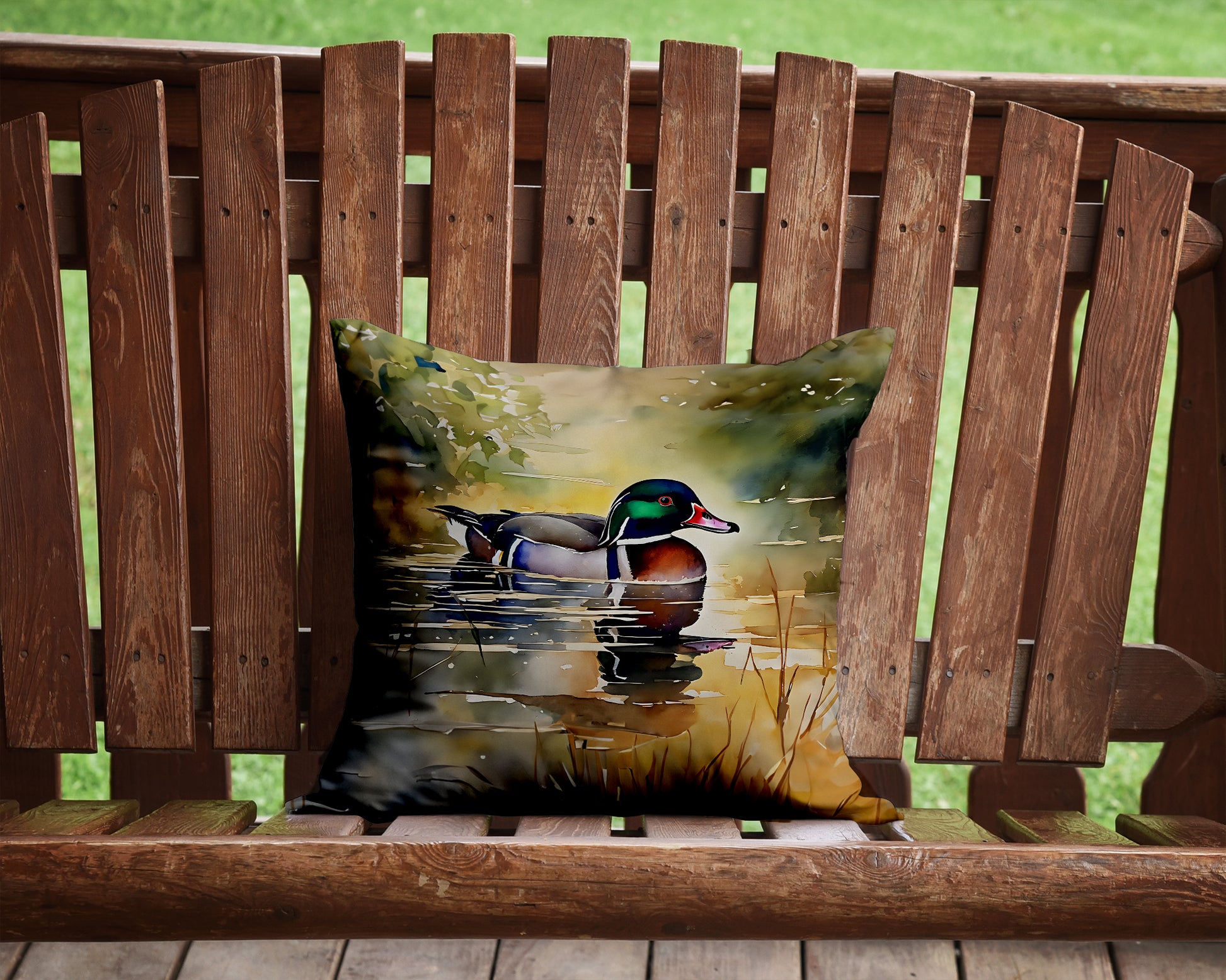 Throw Pillow featuring breed specific Wood Duck artwork. Add a touch of vibrancy and comfort to your outdoor seating with Caroline's Treasures Fabric Decorative Pillow. Measuring approximately 14 inches by 14 inches, this outdoor pillow is crafted to elevate the appeal of your patio furniture, infusing it with vivid color and artistic flair. The pillow includes a 100% Polyester Fabric sham filled with a quality pillow form to provide superior comfort. Innovatively made from our brand new material, specifically woven for its water resistance, this pillow is designed for durability. The soft canvas fabric offers versatility in use, fit for your indoor couch or your outdoor patio, porch, or veranda. The fabric is dyed with colorfast dyes built for resilience against weather conditions, ensuring the pillow retains its beauty over time. Constructed by sewing three fabric pieces to create a sham, the polyester insert is then nestled inside to form the pillow, resulting in an overstuffed pillow that maintains its shape. Both the sham and the pillow insert are proudly made in the United States. As the pillows are handcrafted, there may be minor variations in size, further enhancing their unique charm. Experience comfort in style with Caroline's Treasures Fabric Decorative Pillow.