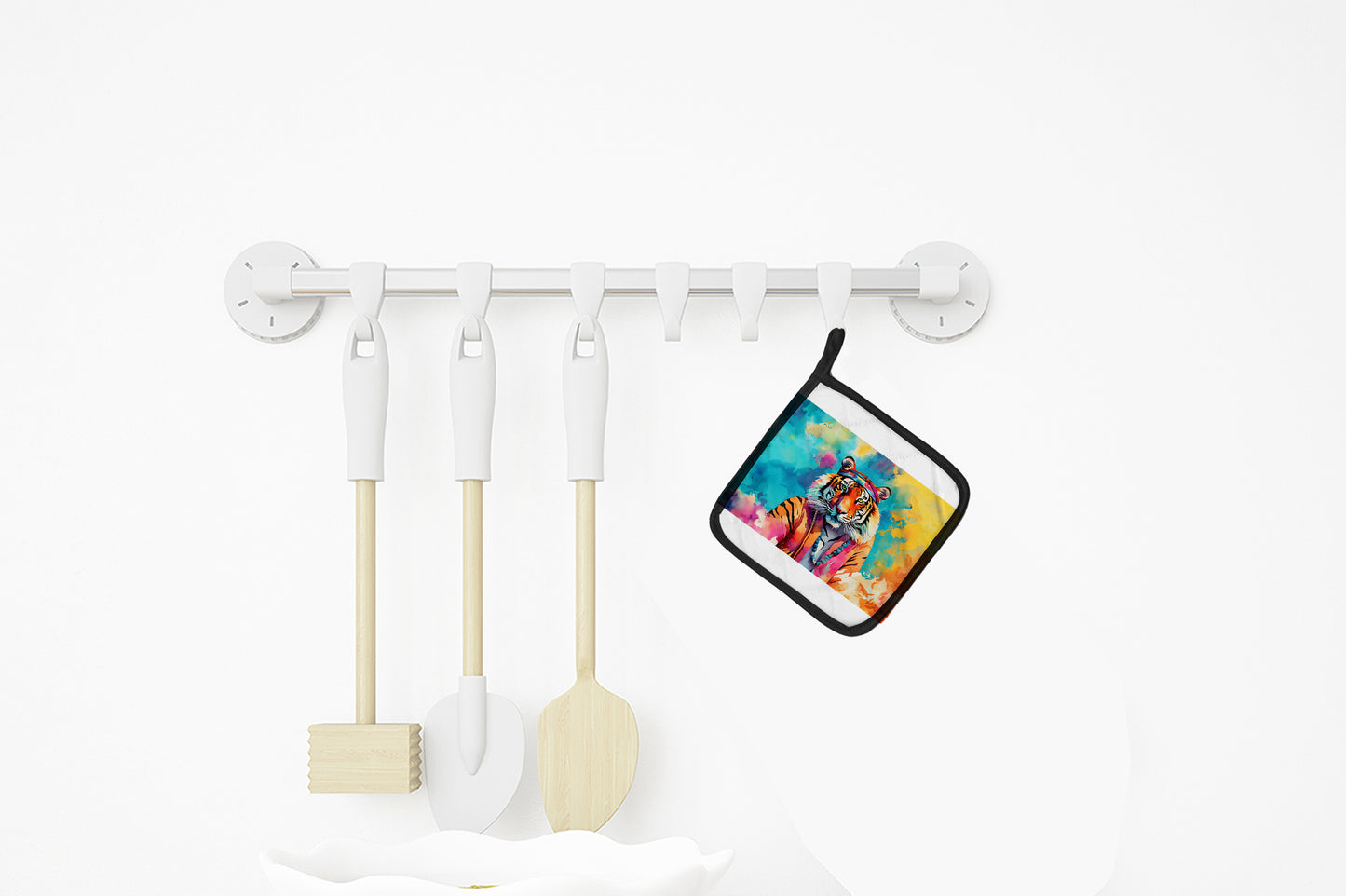 Pair of Pot Holders featuring breed specific Bengal Tiger artwork. A Pair of Pot Holders to match your kitchen decor. Made in the USA these are thick and functional. Full color artwork decorates the front polyester fabric of the hot pad and accented by a black trim. Use these at as a trivet for your Thanksgiving or Christmas tablescape. Filled with insulated fabric and quilted for durability. These colorful pot holders will make a great gift for your favorite home cook or executive chef. Each pot holder measures approximately 7 1/2 inches by 7 1/2 inches. A hanging tab is included.