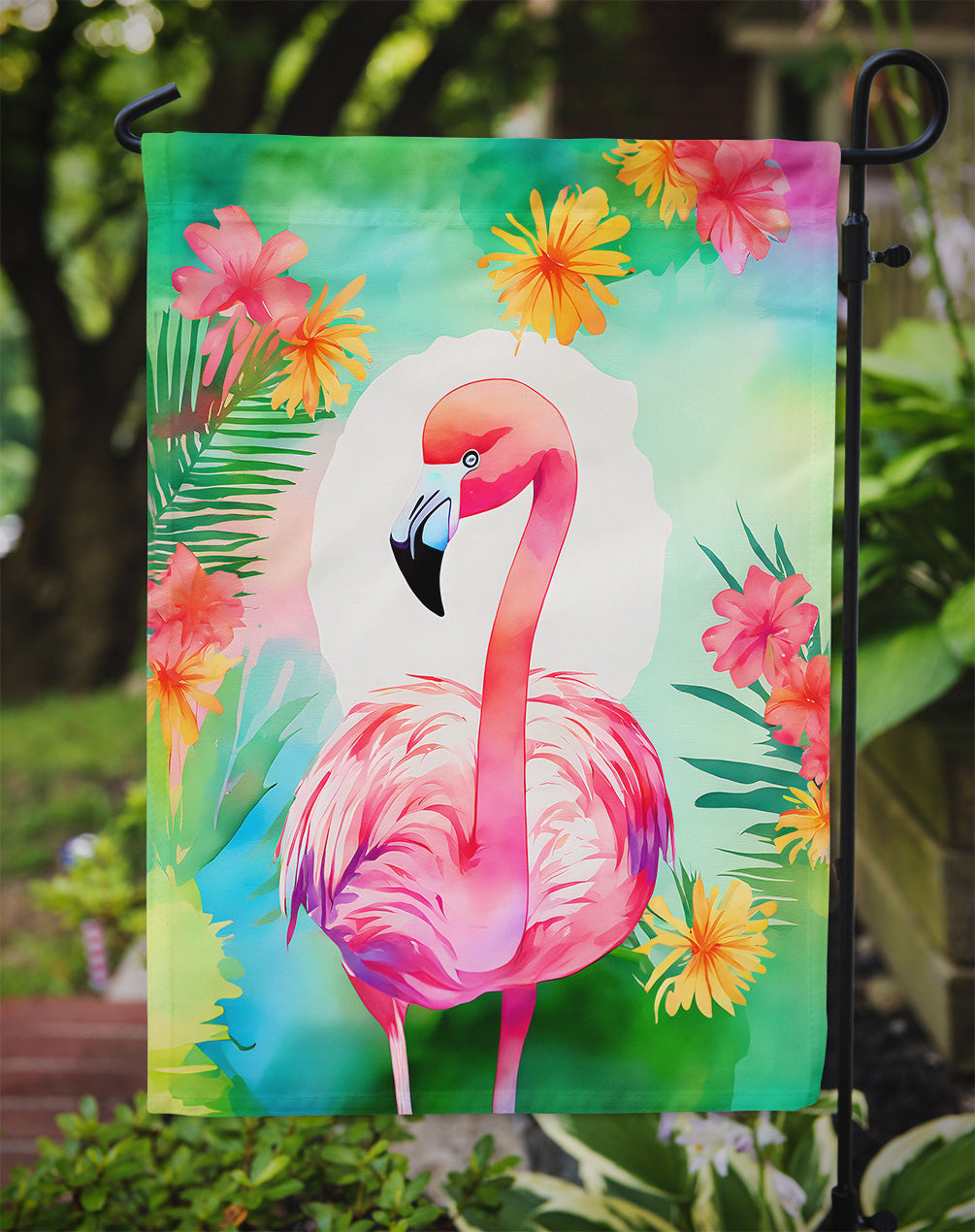 Garden Flag featuring breed specific Flamingo artwork. Enhance the beauty of your garden, patio, or yard with Caroline's Treasures Decorative Garden Flag, proudly made in the USA. Crafted from two pieces of thick, double-sided polyester fabric, this 2-ply garden flag is designed to withstand various weather conditions, making it water-resistant and weatherproof. Featuring correctly readable words on both sides, this garden flag offers a delightful visual experience from any angle. With its heavier weight, it stands out among other garden flags, ensuring stability and durability even in wind, rain, and snow. Measuring approximately 11 1/4 inches by 15 1/2 inches, this flag allows you to personalize your outdoor decor. It comes with a 1 1/2-inch sleeve sewn in, allowing easy attachment to any standard garden flag stand or garden size porch hanger (sold separately). Make a statement in your outdoor space with Caroline's Treasures Decorative Garden Flag, a vibrant and high-quality flag that adds color and personality to your surroundings. Proudly made in the USA, it's a symbol of quality craftsmanship and attention to detail.