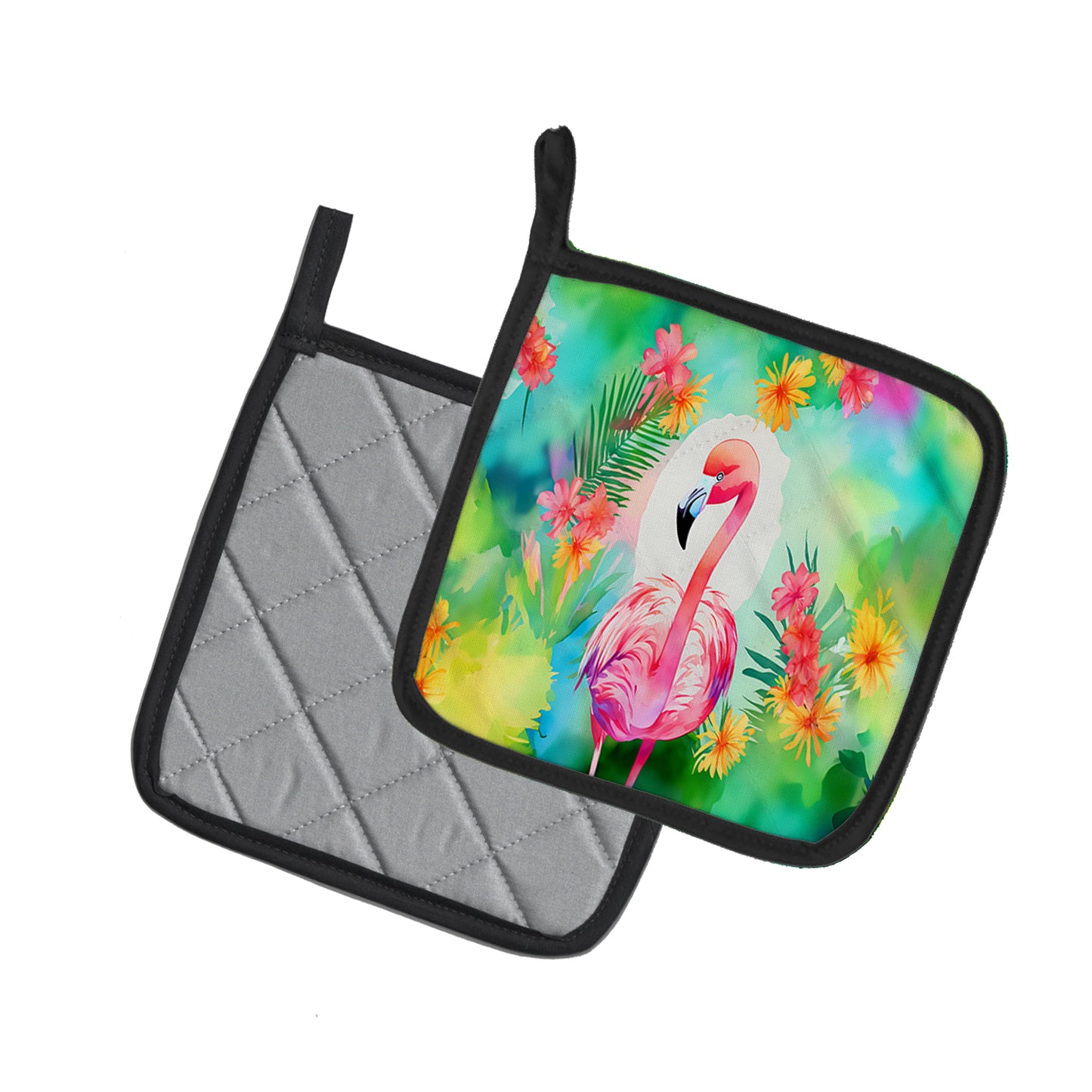 Pair of Pot Holders featuring breed specific Flamingo artwork. A Pair of Pot Holders to match your kitchen decor. Made in the USA these are thick and functional. Full color artwork decorates the front polyester fabric of the hot pad and accented by a black trim. Use these at as a trivet for your Thanksgiving or Christmas tablescape. Filled with insulated fabric and quilted for durability. These colorful pot holders will make a great gift for your favorite home cook or executive chef. Each pot holder measures approximately 7 1/2 inches by 7 1/2 inches. A hanging tab is included.