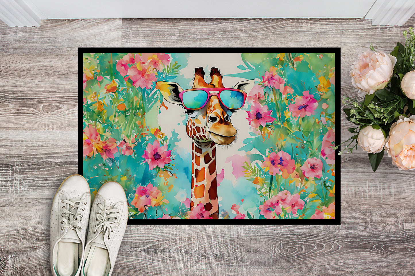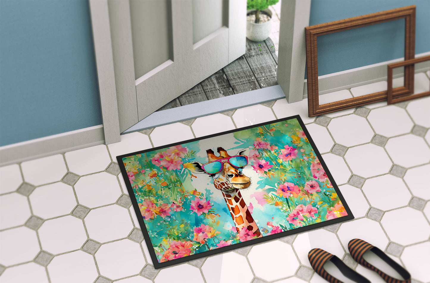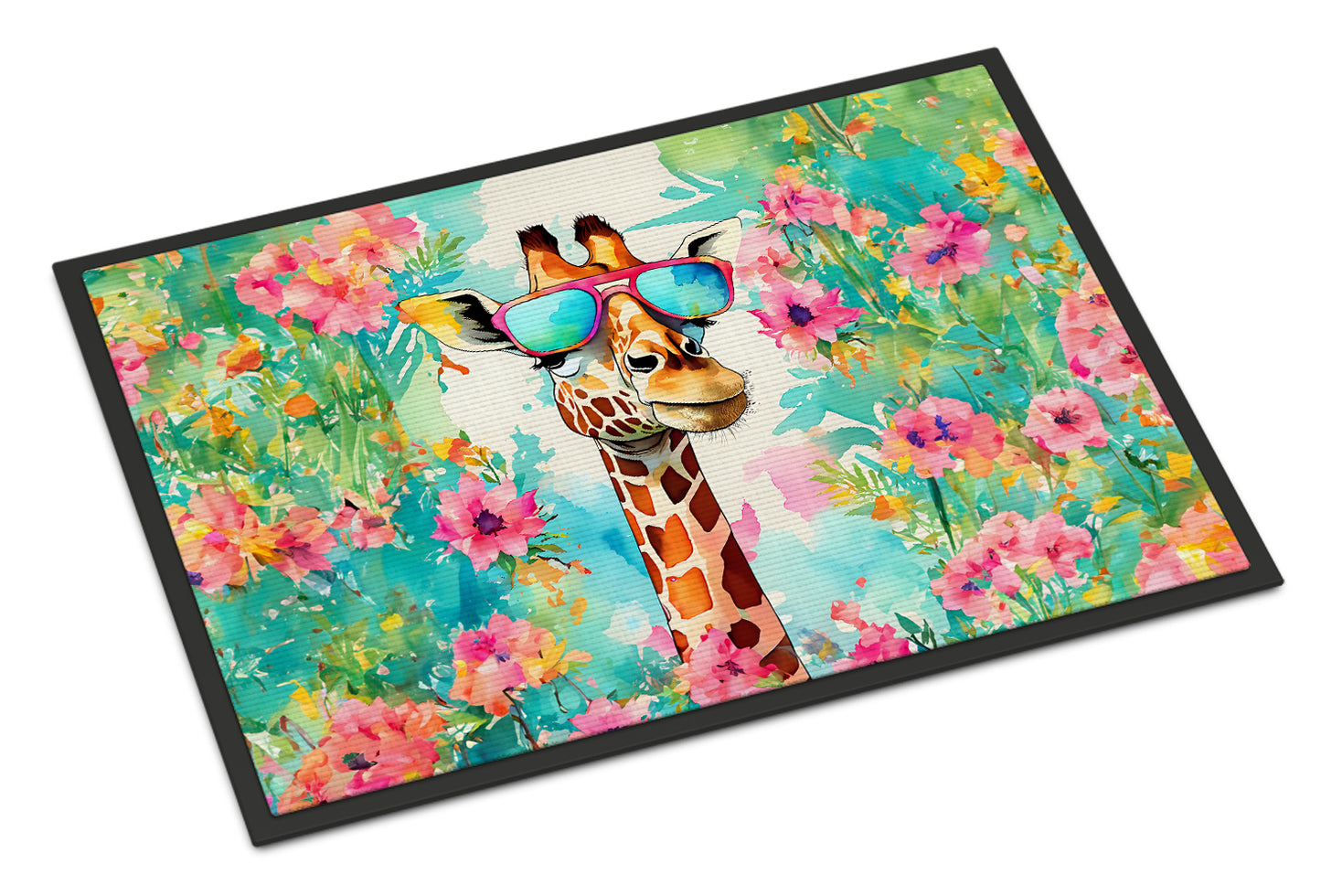 Doormat featuring breed specific Giraffe artwork. Welcome your guests in style with our Artwork Door Mat, designed to withstand almost any weather condition. This mat, measuring approximately 18 by 27 inches, is held together by durable black binding tape. Its top layer, composed of polyester felt, is dyed with the eye-catching image you see on the mat. A few layers below provide the mat with stability, while its rubber bottom is stamped to help prevent slipping and ensures safety. Our mat works wonderfully as both an indoor or outdoor door mat. For cleaning, simply hose it off with water or use a power washer - no need for any cleaner that produces suds. Avoid scrubbing with a brush, instead, opt for the vacuum on floor setting. Designed manufactured and printed in the USA, this mat is a perfect addition to your porch, outdoor kitchen, entryway, or any indoor space. Its unique design makes it a charming decorative rug that greets your guests and adds a stylish touch to your home decor.