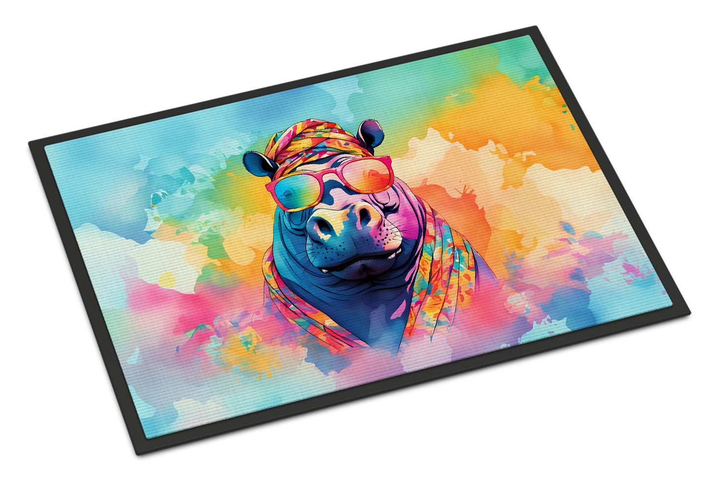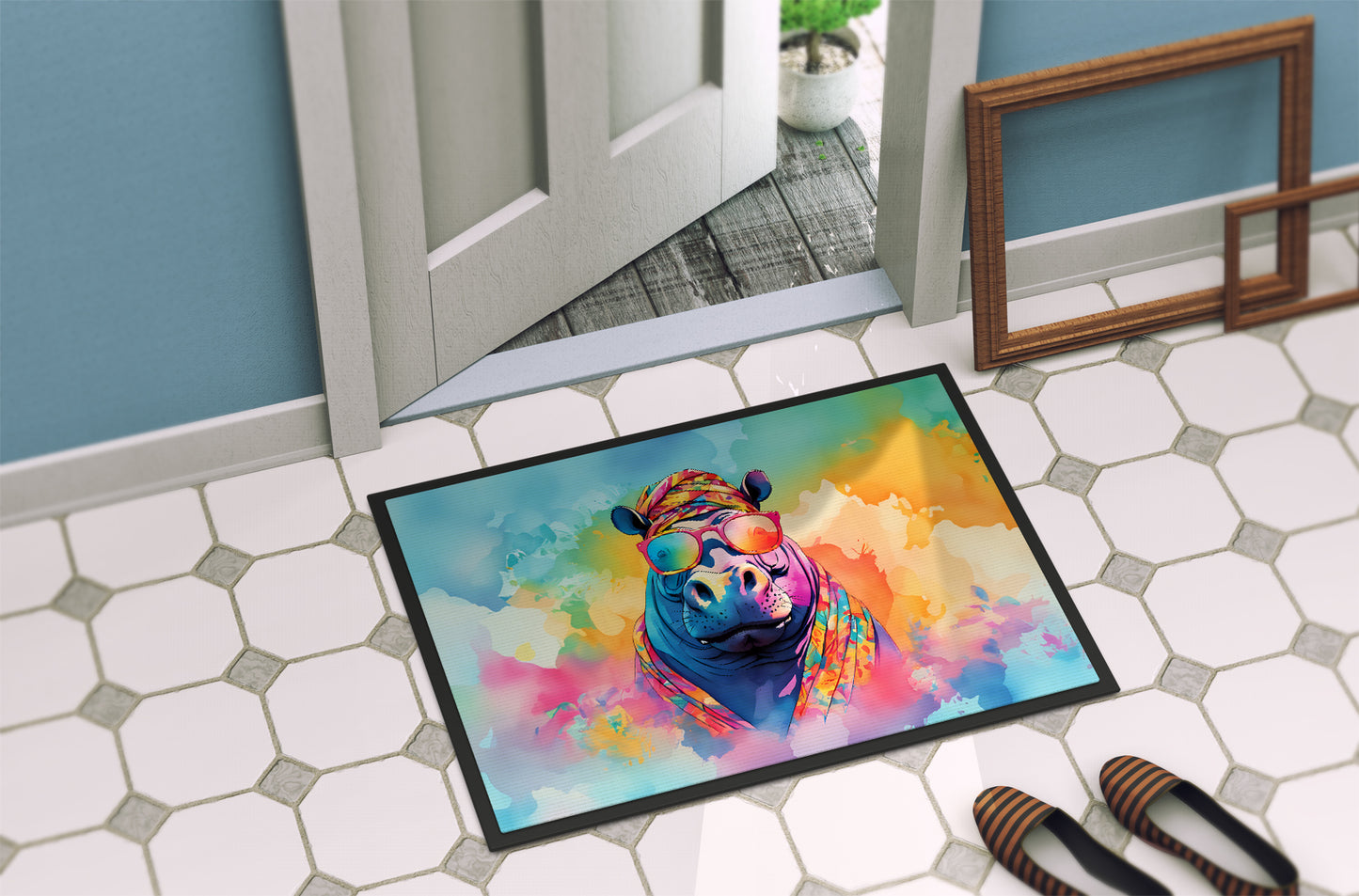 Doormat featuring breed specific Hippopotamus artwork. Welcome your guests in style with our Artwork Door Mat, designed to withstand almost any weather condition. This mat, measuring approximately 18 by 27 inches, is held together by durable black binding tape. Its top layer, composed of polyester felt, is dyed with the eye-catching image you see on the mat. A few layers below provide the mat with stability, while its rubber bottom is stamped to help prevent slipping and ensures safety. Our mat works wonderfully as both an indoor or outdoor door mat. For cleaning, simply hose it off with water or use a power washer - no need for any cleaner that produces suds. Avoid scrubbing with a brush, instead, opt for the vacuum on floor setting. Designed manufactured and printed in the USA, this mat is a perfect addition to your porch, outdoor kitchen, entryway, or any indoor space. Its unique design makes it a charming decorative rug that greets your guests and adds a stylish touch to your home decor.
