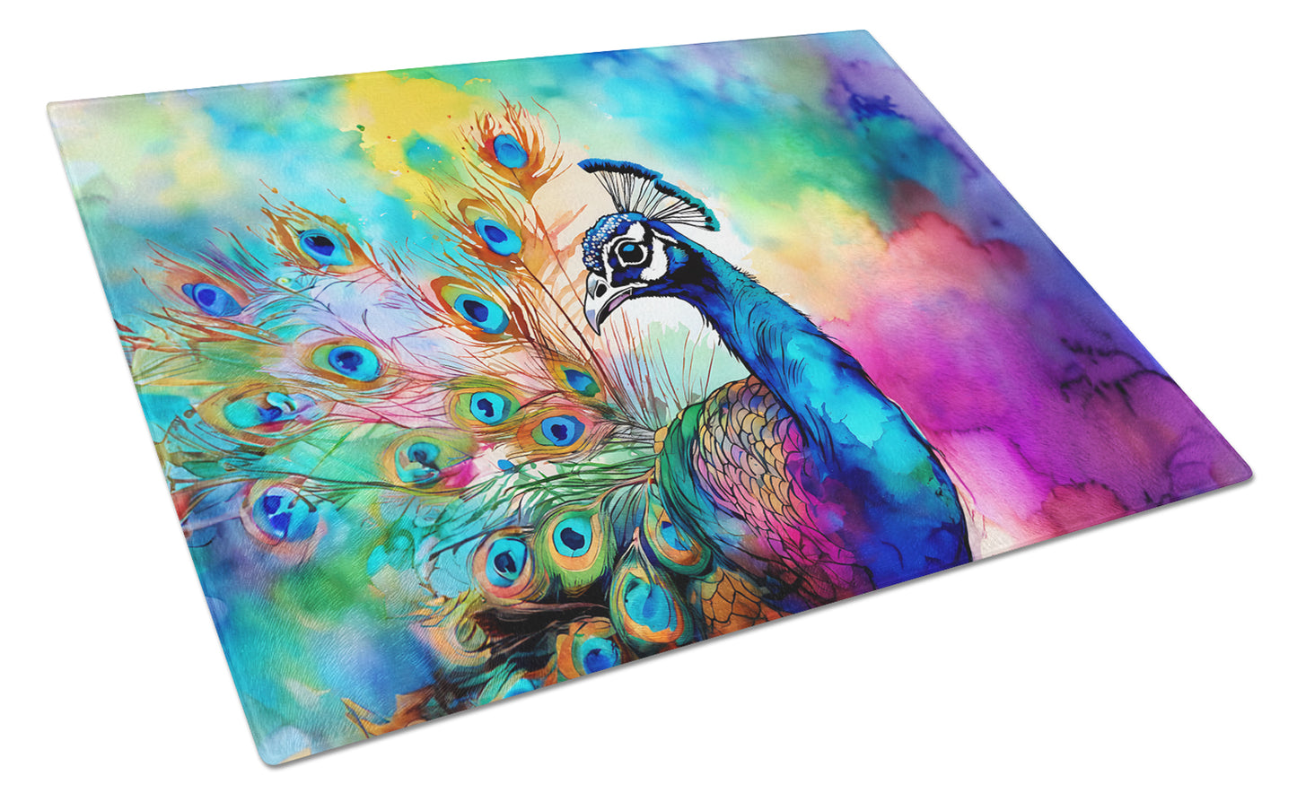 Glass Cutting Board featuring breed specific Peacock artwork. Introduce your kitchen to the vibrant, large Decorative Glass Cutting Board from Caroline's Treasures. Crafted from resilient tempered glass, this board is not only a utilitarian necessity but also a colorful art piece. With its generous dimensions of 15 inches in height and 12 inches in length, it offers ample space for all your cutting needs. Every piece showcases captivating artwork from distinguished artists, bringing an aesthetic edge to your kitchen. Beyond its attractive design, this cutting board ensures your countertop stays pristine and unscathed, owing to its heat-resistant properties. Engineered with user convenience in mind, it features non-skid feet for stability, and rounded corners for additional safety. Its robust construction renders it virtually unbreakable, guaranteeing longevity. The board comes with protective feet bumpers, maintaining its position during use. This product is recommended to be hand washed only. Proudly printed and assembled in the United States, this cutting board exemplifies superior craftsmanship. With Caroline's Treasures' Decorative Glass Cutting Board, you're investing in a blend of functionality and artistic flair.
