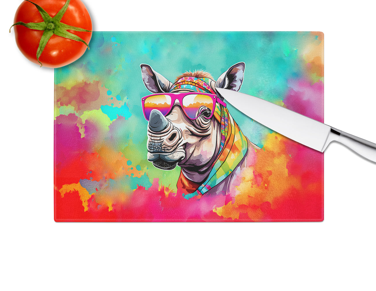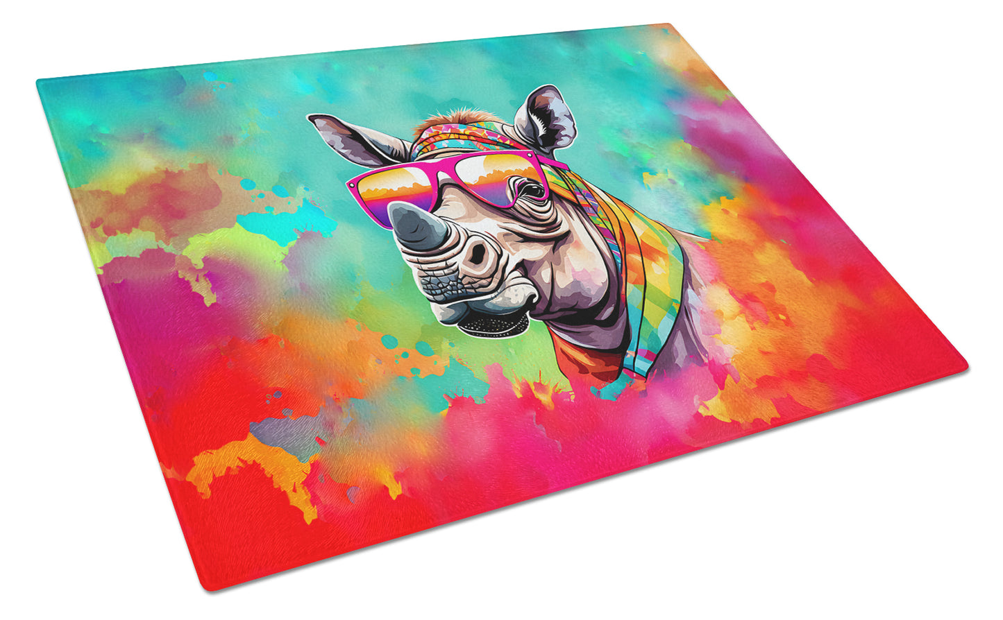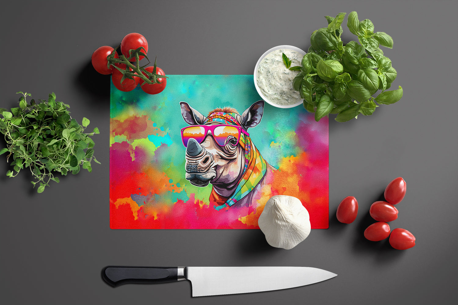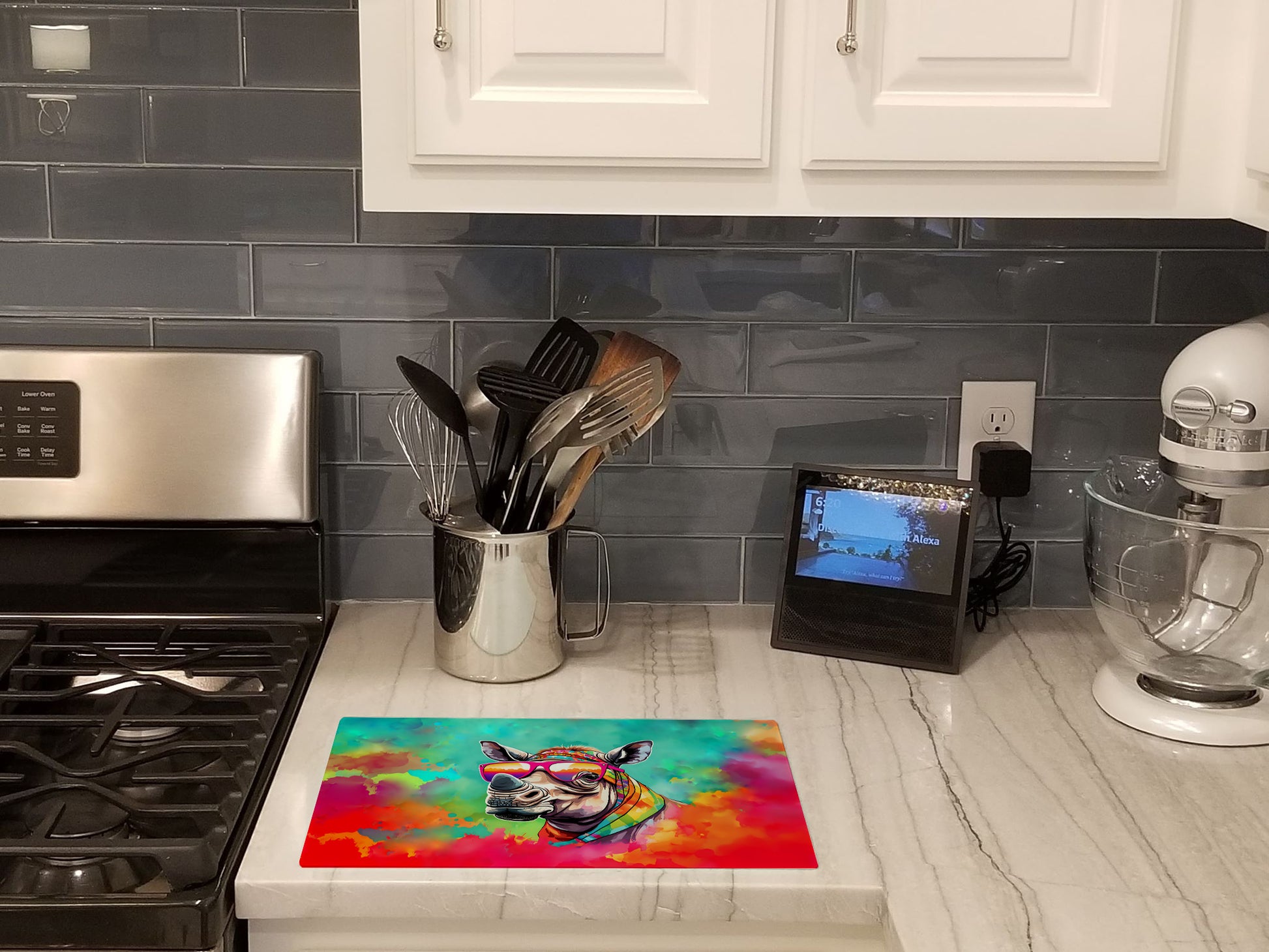 Glass Cutting Board featuring breed specific Rhinoceros artwork. Introduce your kitchen to the vibrant, large Decorative Glass Cutting Board from Caroline's Treasures. Crafted from resilient tempered glass, this board is not only a utilitarian necessity but also a colorful art piece. With its generous dimensions of 15 inches in height and 12 inches in length, it offers ample space for all your cutting needs. Every piece showcases captivating artwork from distinguished artists, bringing an aesthetic edge to your kitchen. Beyond its attractive design, this cutting board ensures your countertop stays pristine and unscathed, owing to its heat-resistant properties. Engineered with user convenience in mind, it features non-skid feet for stability, and rounded corners for additional safety. Its robust construction renders it virtually unbreakable, guaranteeing longevity. The board comes with protective feet bumpers, maintaining its position during use. This product is recommended to be hand washed only. Proudly printed and assembled in the United States, this cutting board exemplifies superior craftsmanship. With Caroline's Treasures' Decorative Glass Cutting Board, you're investing in a blend of functionality and artistic flair.