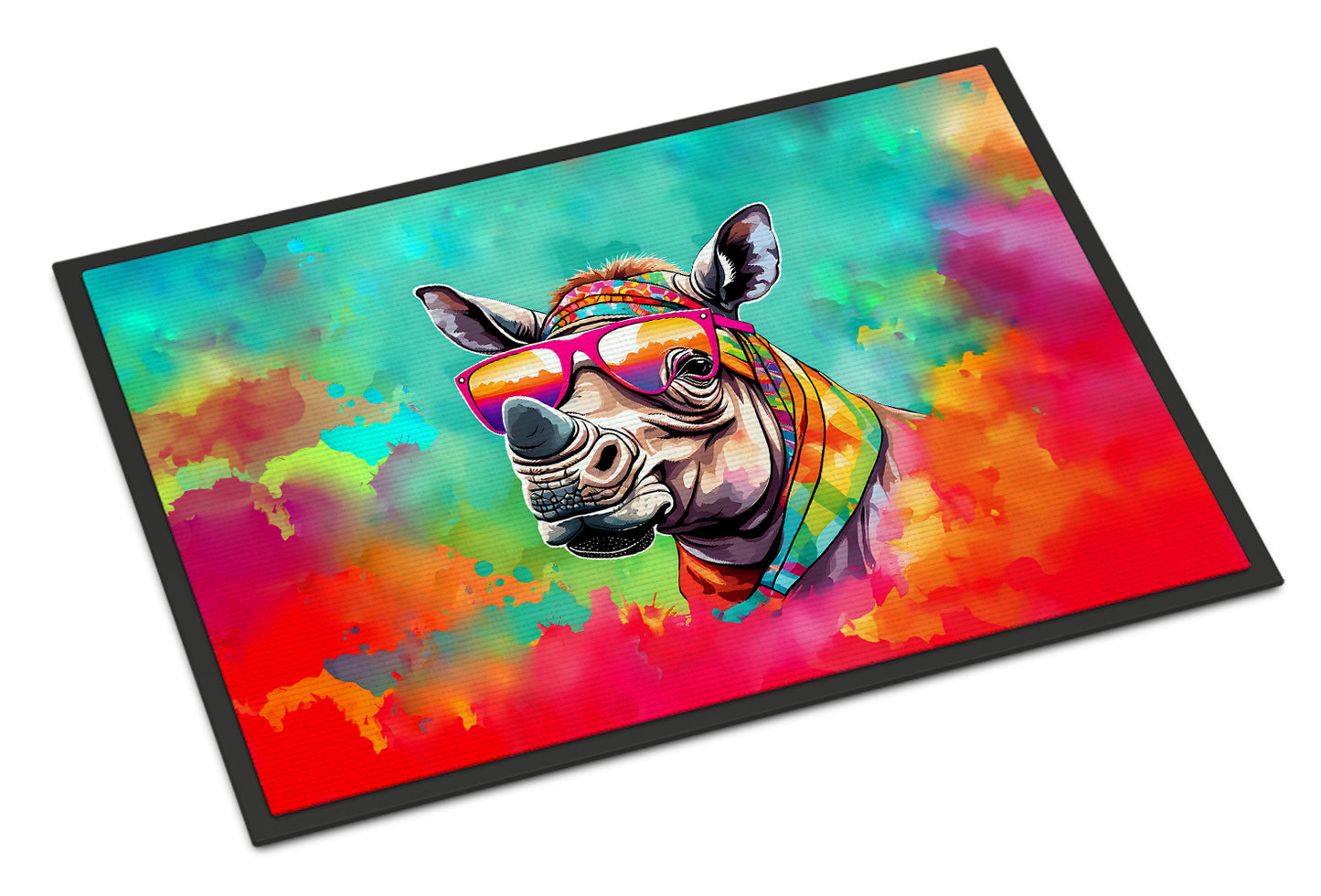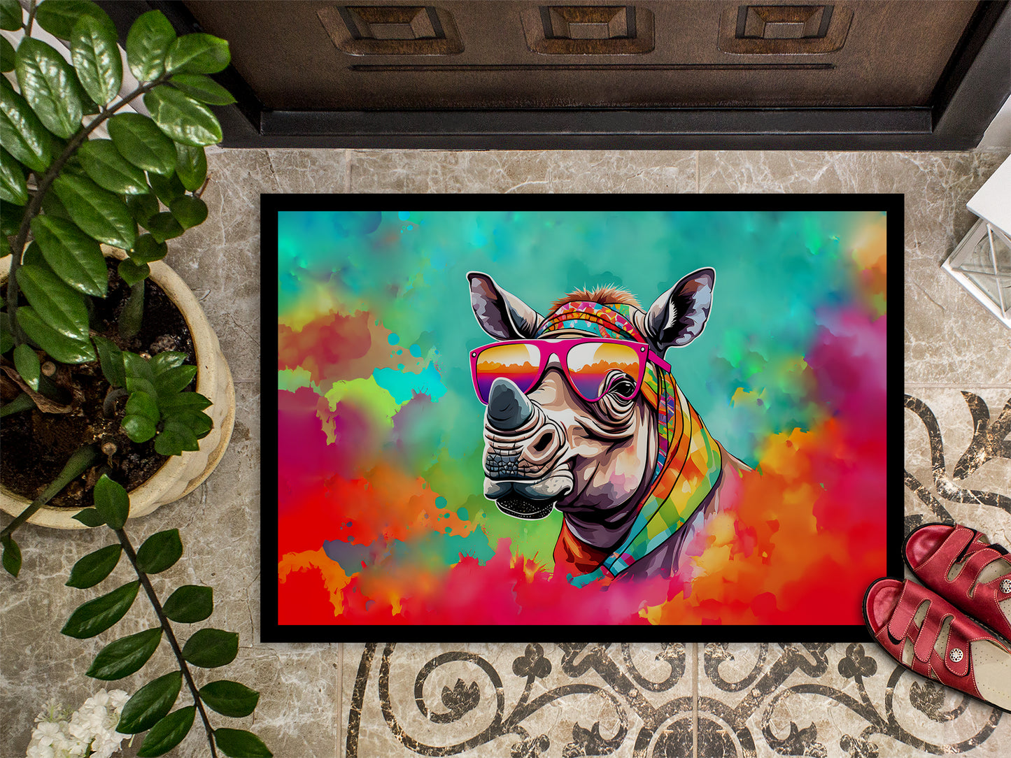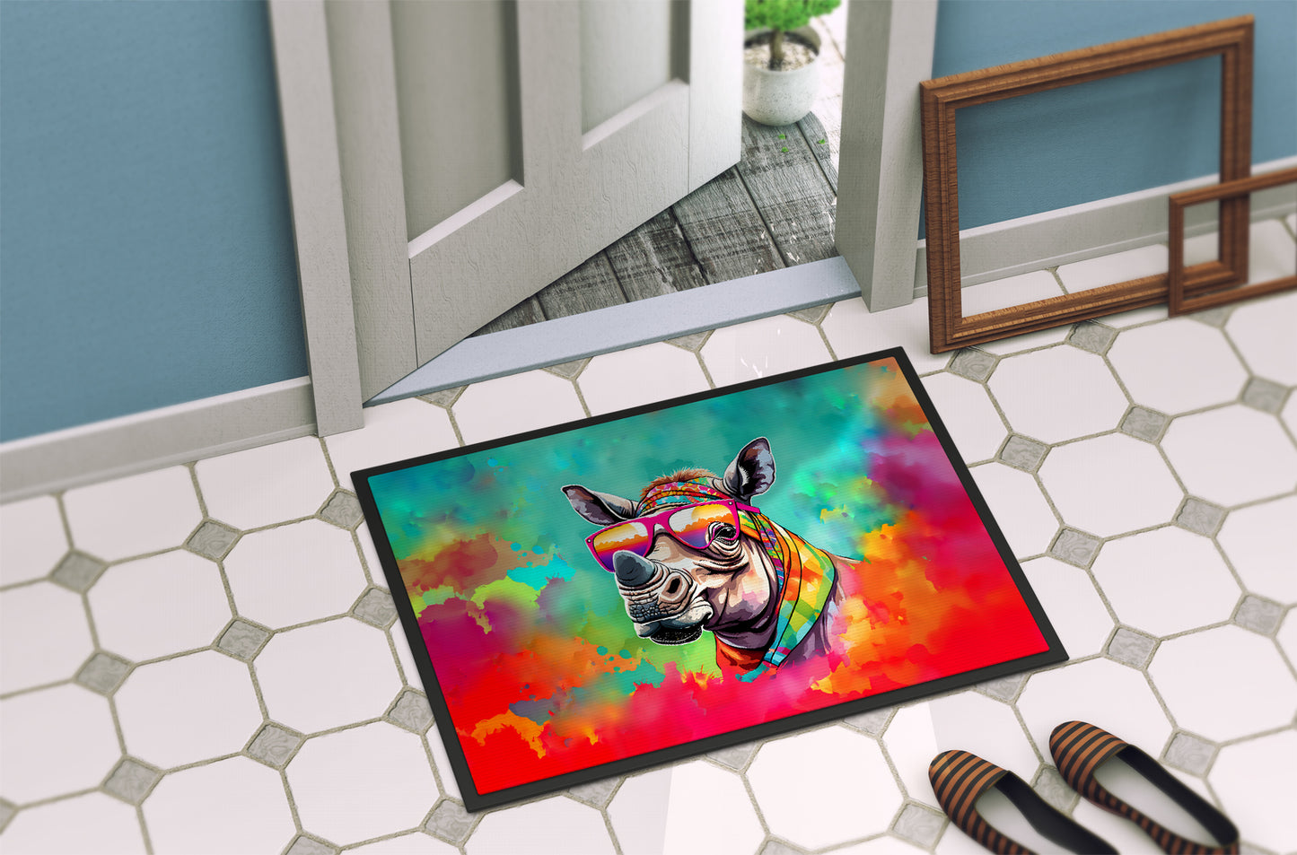Doormat featuring breed specific Rhinoceros artwork. Welcome your guests in style with our Artwork Door Mat, designed to withstand almost any weather condition. This mat, measuring approximately 18 by 27 inches, is held together by durable black binding tape. Its top layer, composed of polyester felt, is dyed with the eye-catching image you see on the mat. A few layers below provide the mat with stability, while its rubber bottom is stamped to help prevent slipping and ensures safety. Our mat works wonderfully as both an indoor or outdoor door mat. For cleaning, simply hose it off with water or use a power washer - no need for any cleaner that produces suds. Avoid scrubbing with a brush, instead, opt for the vacuum on floor setting. Designed manufactured and printed in the USA, this mat is a perfect addition to your porch, outdoor kitchen, entryway, or any indoor space. Its unique design makes it a charming decorative rug that greets your guests and adds a stylish touch to your home decor.