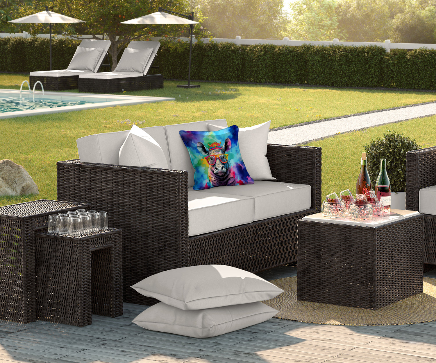 Throw Pillow featuring breed specific Rhinoceros artwork. Revitalize your outdoor or indoor living space with Caroline's Treasures 18x18 Fabric Decorative Pillow. With a generously sized dimension of approximately 18 inches by 18 inches, this pillow makes a comfortable and aesthetic addition to any seating area. Made from a unique, water-resistant material developed by Caroline's Treasures, the pillow sham is 100% polyester fabric that's durable and ready to weather any condition. Its vibrant, full-color artwork will not fade over time as it is dyed with color-fast dyes. Whether you place it on your patio furniture, porch, veranda, or indoor couch, its soft canvas fabric ensures a cozy experience. The pillow is handcrafted in the United States, featuring a sham created from three pieces of fabric and a polyester insert for enduring shape and overstuffed comfort. Despite being robustly built to endure the outdoors, it is as soft and snug as your favorite indoor cushions. Please note, as all our pillows are handmade, sizes may vary slightly, adding to the charm of this unique decorative item.