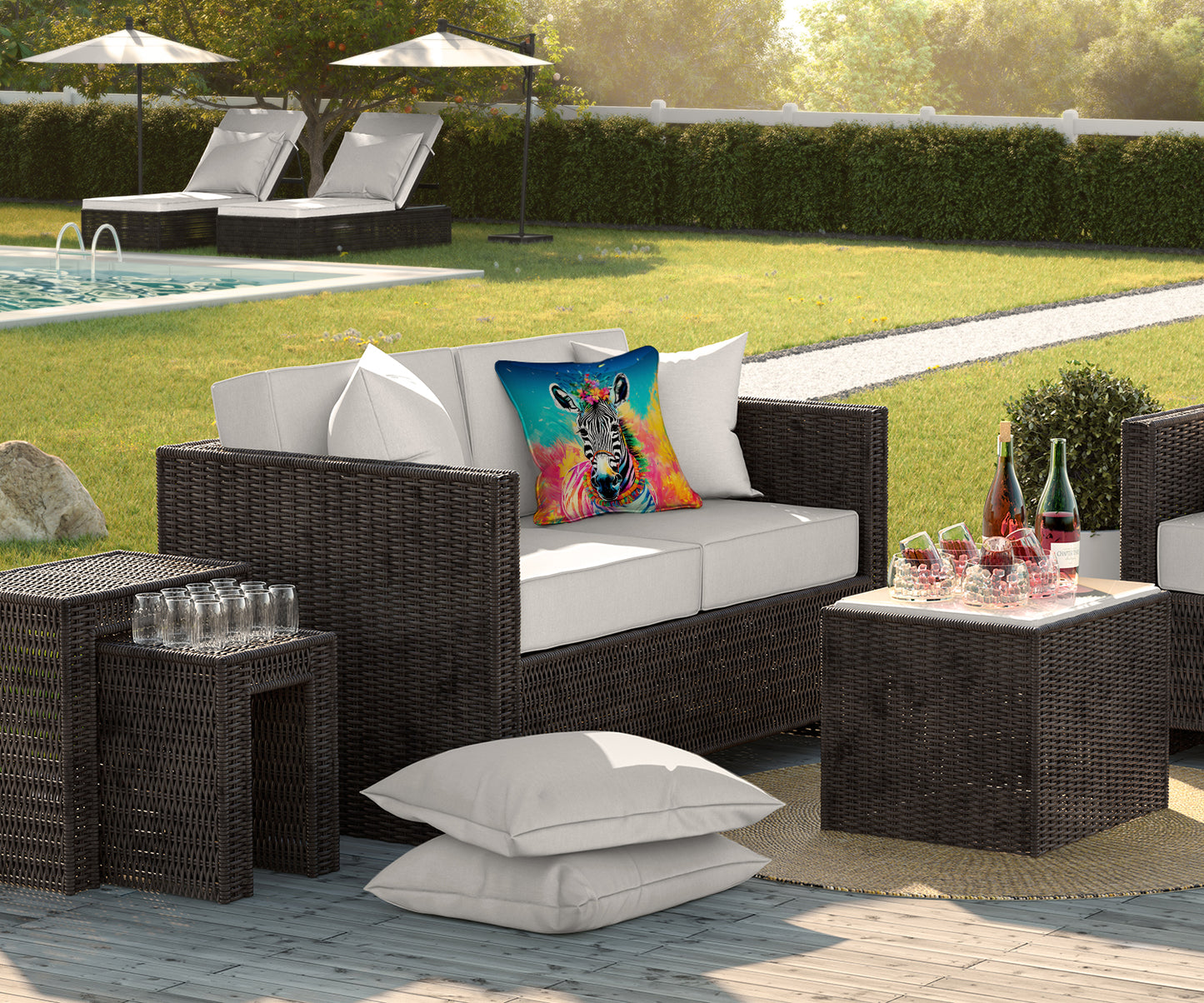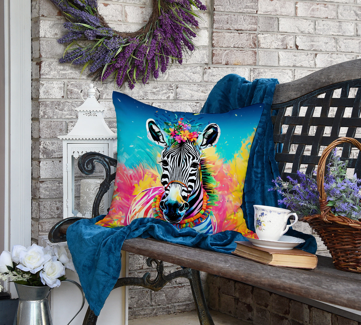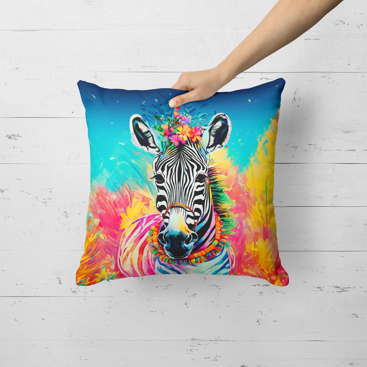 Throw Pillow featuring breed specific Zebra artwork. Revitalize your outdoor or indoor living space with Caroline's Treasures 18x18 Fabric Decorative Pillow. With a generously sized dimension of approximately 18 inches by 18 inches, this pillow makes a comfortable and aesthetic addition to any seating area. Made from a unique, water-resistant material developed by Caroline's Treasures, the pillow sham is 100% polyester fabric that's durable and ready to weather any condition. Its vibrant, full-color artwork will not fade over time as it is dyed with color-fast dyes. Whether you place it on your patio furniture, porch, veranda, or indoor couch, its soft canvas fabric ensures a cozy experience. The pillow is handcrafted in the United States, featuring a sham created from three pieces of fabric and a polyester insert for enduring shape and overstuffed comfort. Despite being robustly built to endure the outdoors, it is as soft and snug as your favorite indoor cushions. Please note, as all our pillows are handmade, sizes may vary slightly, adding to the charm of this unique decorative item.