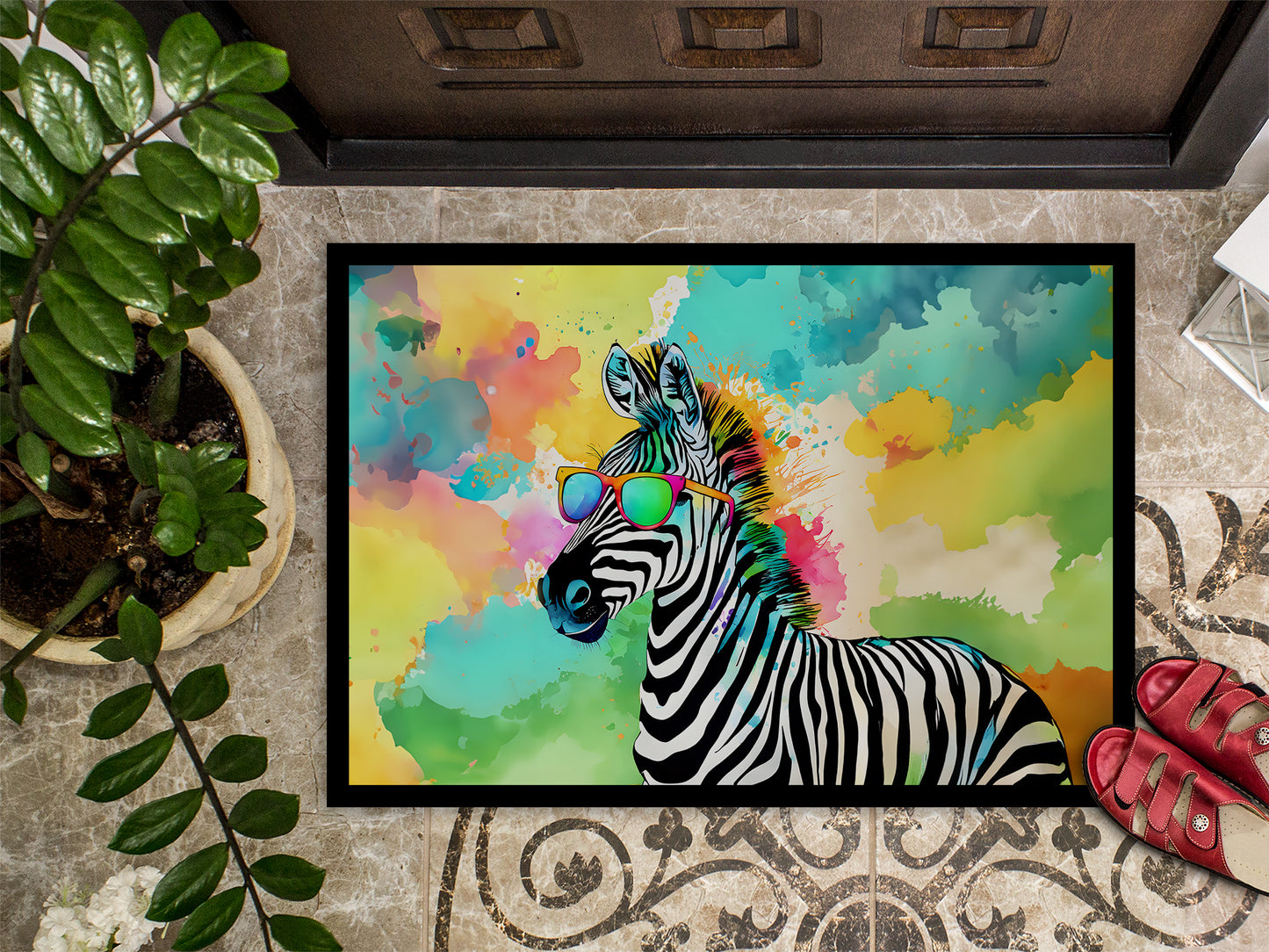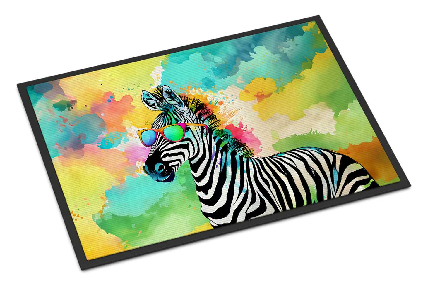 Doormat featuring breed specific Zebra artwork. Welcome your guests in style with our Artwork Door Mat, designed to withstand almost any weather condition. This mat, measuring approximately 18 by 27 inches, is held together by durable black binding tape. Its top layer, composed of polyester felt, is dyed with the eye-catching image you see on the mat. A few layers below provide the mat with stability, while its rubber bottom is stamped to help prevent slipping and ensures safety. Our mat works wonderfully as both an indoor or outdoor door mat. For cleaning, simply hose it off with water or use a power washer - no need for any cleaner that produces suds. Avoid scrubbing with a brush, instead, opt for the vacuum on floor setting. Designed manufactured and printed in the USA, this mat is a perfect addition to your porch, outdoor kitchen, entryway, or any indoor space. Its unique design makes it a charming decorative rug that greets your guests and adds a stylish touch to your home decor.