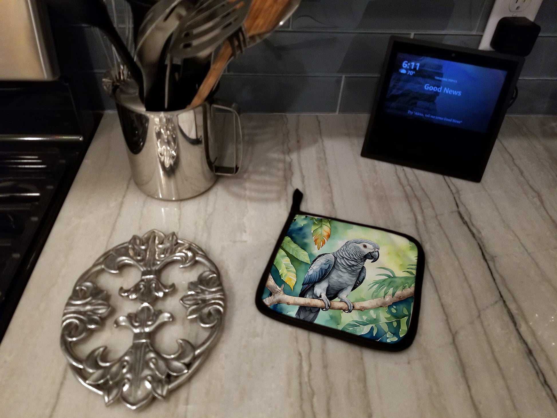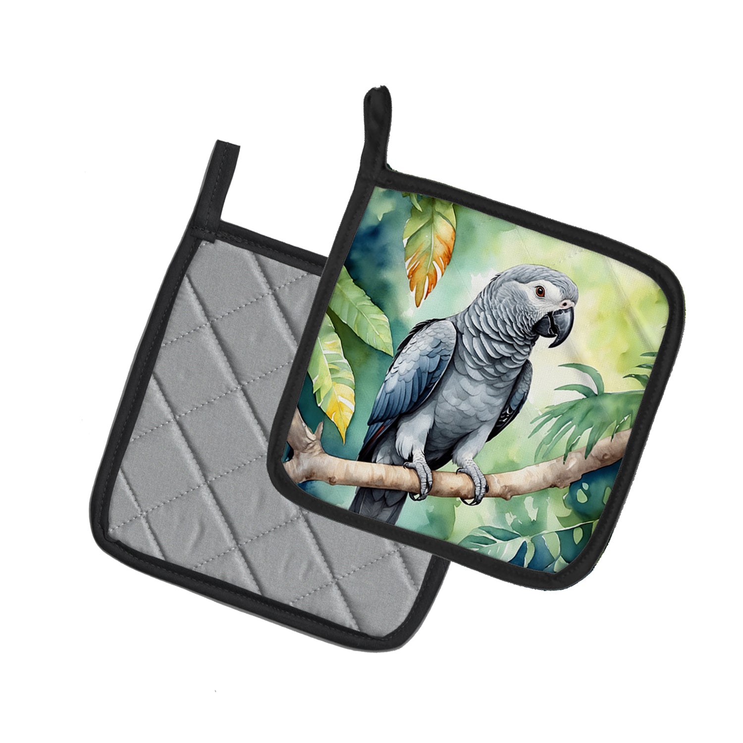 Pair of Pot Holders featuring breed specific African Grey Parrot artwork. A Pair of Pot Holders to match your kitchen decor. Made in the USA these are thick and functional. Full color artwork decorates the front polyester fabric of the hot pad and accented by a black trim. Use these at as a trivet for your Thanksgiving or Christmas tablescape. Filled with insulated fabric and quilted for durability. These colorful pot holders will make a great gift for your favorite home cook or executive chef. Each pot holder measures approximately 7 1/2 inches by 7 1/2 inches. A hanging tab is included.