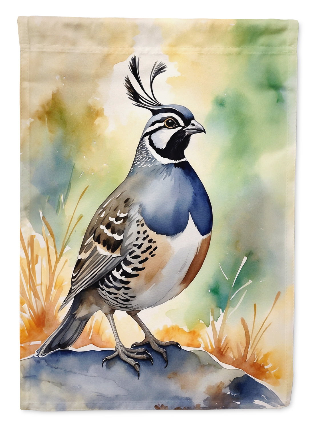 Garden Flag featuring breed specific California Quail artwork. Enhance the beauty of your garden, patio, or yard with Caroline's Treasures Decorative Garden Flag, proudly made in the USA. Crafted from two pieces of thick, double-sided polyester fabric, this 2-ply garden flag is designed to withstand various weather conditions, making it water-resistant and weatherproof. Featuring correctly readable words on both sides, this garden flag offers a delightful visual experience from any angle. With its heavier weight, it stands out among other garden flags, ensuring stability and durability even in wind, rain, and snow. Measuring approximately 11 1/4 inches by 15 1/2 inches, this flag allows you to personalize your outdoor decor. It comes with a 1 1/2-inch sleeve sewn in, allowing easy attachment to any standard garden flag stand or garden size porch hanger (sold separately). Make a statement in your outdoor space with Caroline's Treasures Decorative Garden Flag, a vibrant and high-quality flag that adds color and personality to your surroundings. Proudly made in the USA, it's a symbol of quality craftsmanship and attention to detail.