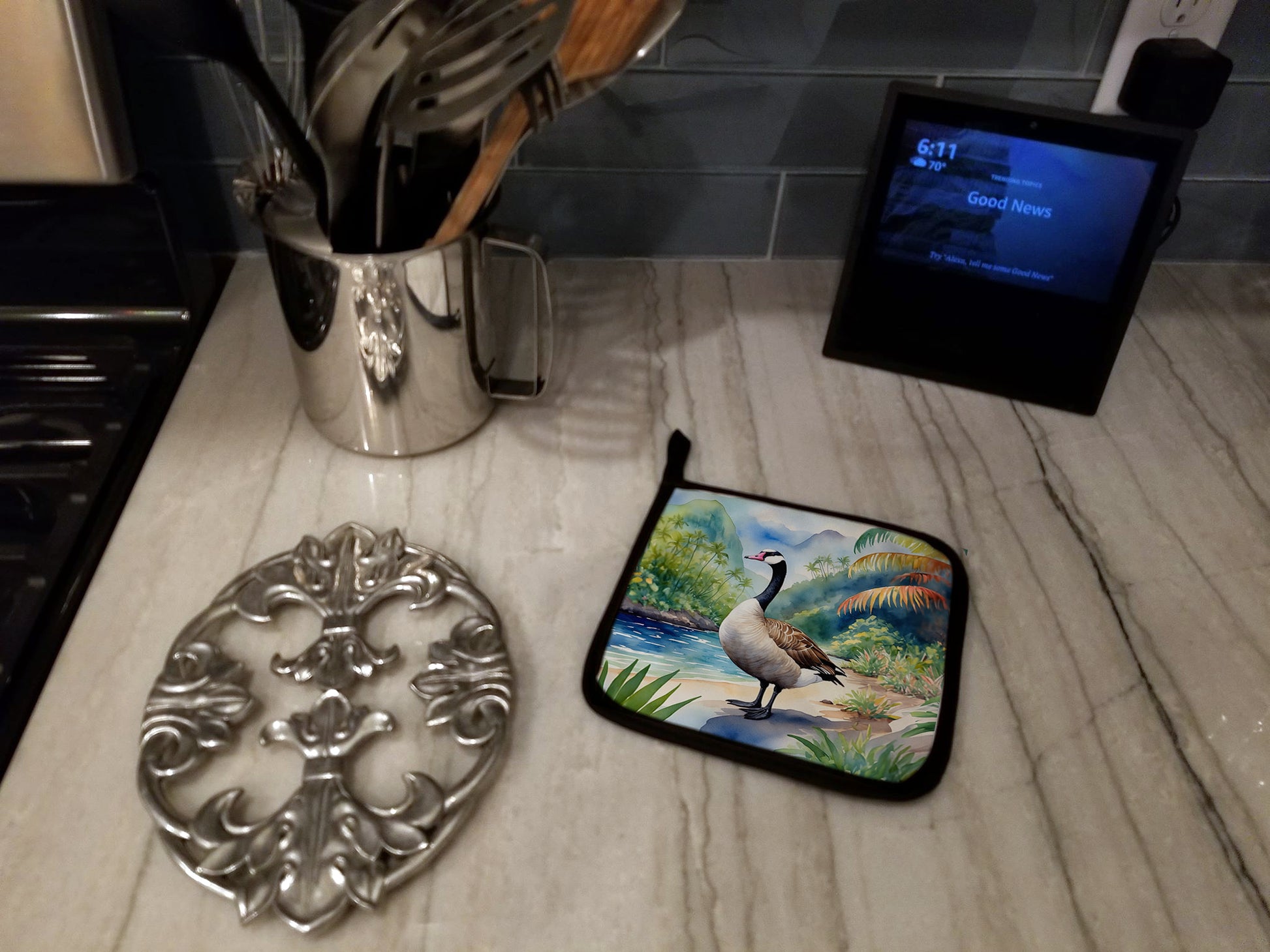 Pair of Pot Holders featuring breed specific Hawaiian Goose artwork. A Pair of Pot Holders to match your kitchen decor. Made in the USA these are thick and functional. Full color artwork decorates the front polyester fabric of the hot pad and accented by a black trim. Use these at as a trivet for your Thanksgiving or Christmas tablescape. Filled with insulated fabric and quilted for durability. These colorful pot holders will make a great gift for your favorite home cook or executive chef. Each pot holder measures approximately 7 1/2 inches by 7 1/2 inches. A hanging tab is included.