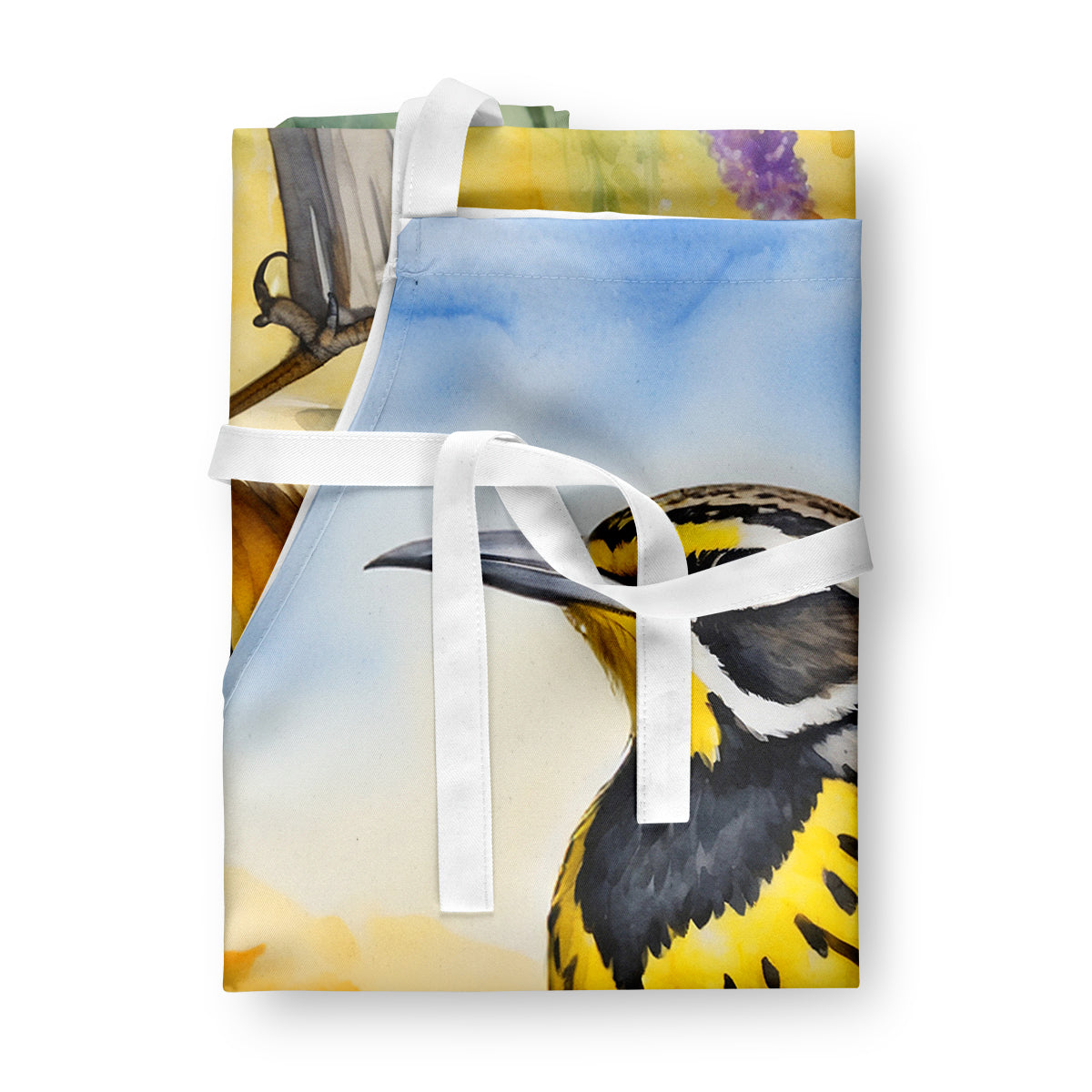 Apron featuring breed specific Western Meadowlark artwork. Elevate your cooking, baking, and grilling experiences with our versatile Kitchen or BBQ Apron. This Bib Style apron isn't just limited to culinary activities - it also serves as an excellent baking apron, artist apron, server apron, gardening apron, or even a dog grooming apron. The apron showcases vibrant full-color artwork contributed by one of our talented artists, bringing a dash of style to your daily tasks. With dimensions of approximately 27"W x 30"H, it provides ample coverage to protect your clothing from spills and splashes. Our apron is meticulously crafted from 100% Ultra Spun Polyester, known for its durability and lightweight nature. The apron comes with white tie straps, ensuring a comfortable and adjustable fit for all. It's a perfect choice for kitchen apron enthusiasts, whether you are a woman or a man. Designed for easy maintenance, this apron is fully machine washable. The quick-drying polyester material actively reduces staining, keeping your apron looking fresh and new for longer. Our beautifully designed apron isn't just a functional kitchen accessory - it's a fashion statement in the culinary world!