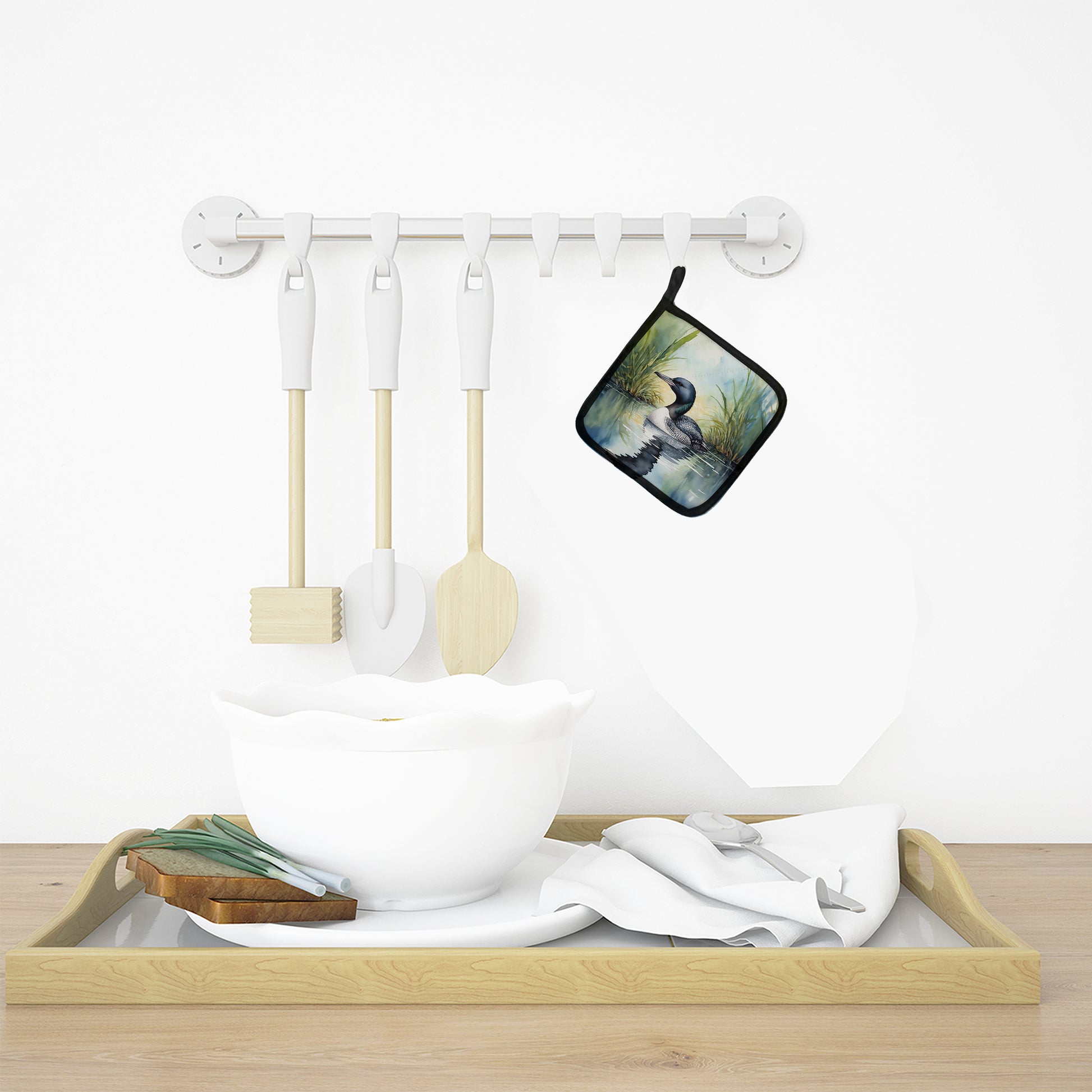 Pair of Pot Holders featuring breed specific Common Loon artwork. A Pair of Pot Holders to match your kitchen decor. Made in the USA these are thick and functional. Full color artwork decorates the front polyester fabric of the hot pad and accented by a black trim. Use these at as a trivet for your Thanksgiving or Christmas tablescape. Filled with insulated fabric and quilted for durability. These colorful pot holders will make a great gift for your favorite home cook or executive chef. Each pot holder measures approximately 7 1/2 inches by 7 1/2 inches. A hanging tab is included.