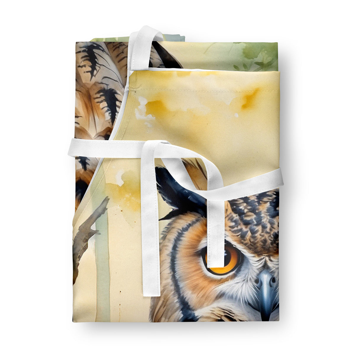 Apron featuring breed specific Eurasian Eagle Owl artwork. Elevate your cooking, baking, and grilling experiences with our versatile Kitchen or BBQ Apron. This Bib Style apron isn't just limited to culinary activities - it also serves as an excellent baking apron, artist apron, server apron, gardening apron, or even a dog grooming apron. The apron showcases vibrant full-color artwork contributed by one of our talented artists, bringing a dash of style to your daily tasks. With dimensions of approximately 27"W x 30"H, it provides ample coverage to protect your clothing from spills and splashes. Our apron is meticulously crafted from 100% Ultra Spun Polyester, known for its durability and lightweight nature. The apron comes with white tie straps, ensuring a comfortable and adjustable fit for all. It's a perfect choice for kitchen apron enthusiasts, whether you are a woman or a man. Designed for easy maintenance, this apron is fully machine washable. The quick-drying polyester material actively reduces staining, keeping your apron looking fresh and new for longer. Our beautifully designed apron isn't just a functional kitchen accessory - it's a fashion statement in the culinary world!
