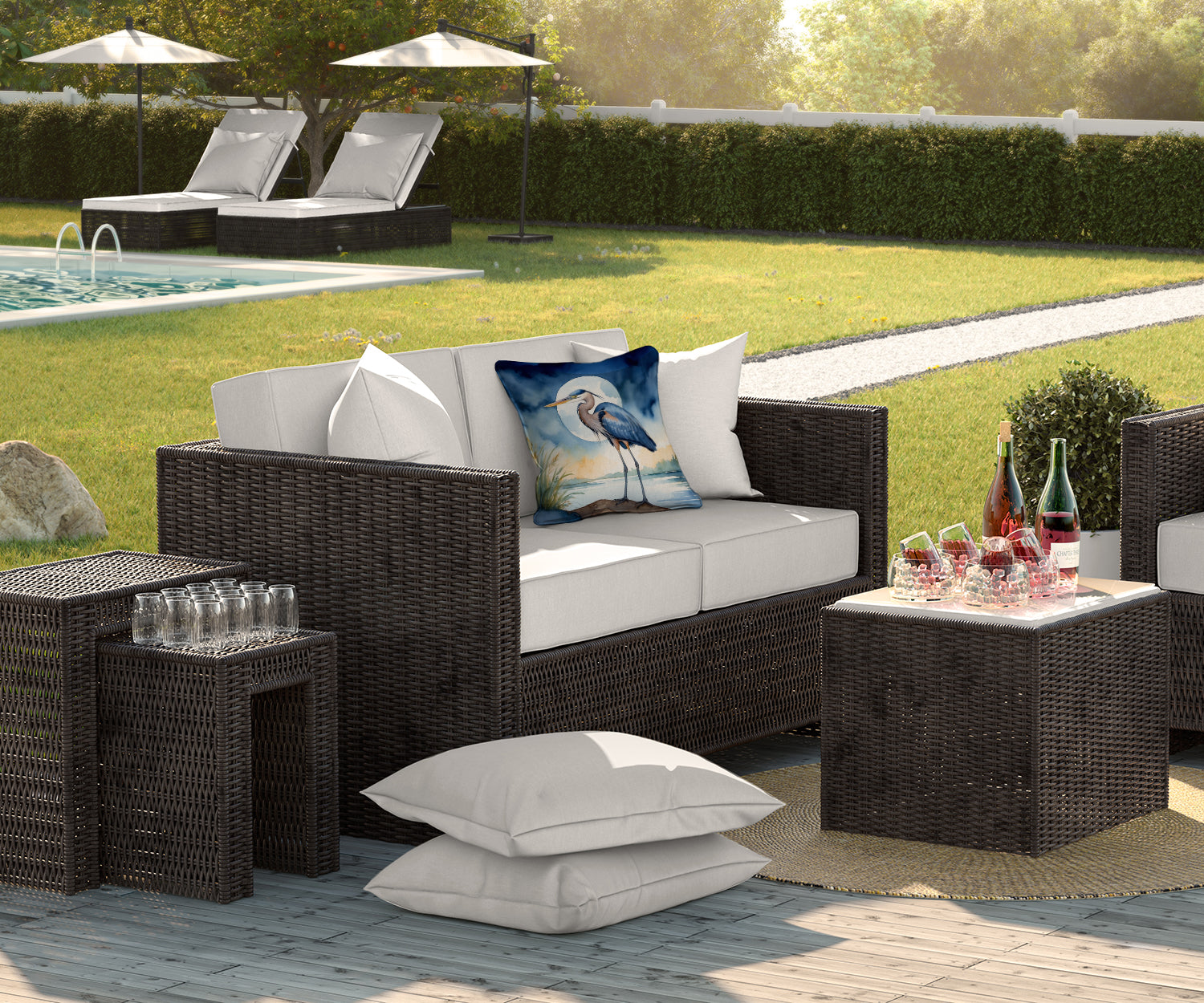 Throw Pillow featuring breed specific Blue Heron artwork. Revitalize your outdoor or indoor living space with Caroline's Treasures 18x18 Fabric Decorative Pillow. With a generously sized dimension of approximately 18 inches by 18 inches, this pillow makes a comfortable and aesthetic addition to any seating area. Made from a unique, water-resistant material developed by Caroline's Treasures, the pillow sham is 100% polyester fabric that's durable and ready to weather any condition. Its vibrant, full-color artwork will not fade over time as it is dyed with color-fast dyes. Whether you place it on your patio furniture, porch, veranda, or indoor couch, its soft canvas fabric ensures a cozy experience. The pillow is handcrafted in the United States, featuring a sham created from three pieces of fabric and a polyester insert for enduring shape and overstuffed comfort. Despite being robustly built to endure the outdoors, it is as soft and snug as your favorite indoor cushions. Please note, as all our pillows are handmade, sizes may vary slightly, adding to the charm of this unique decorative item.