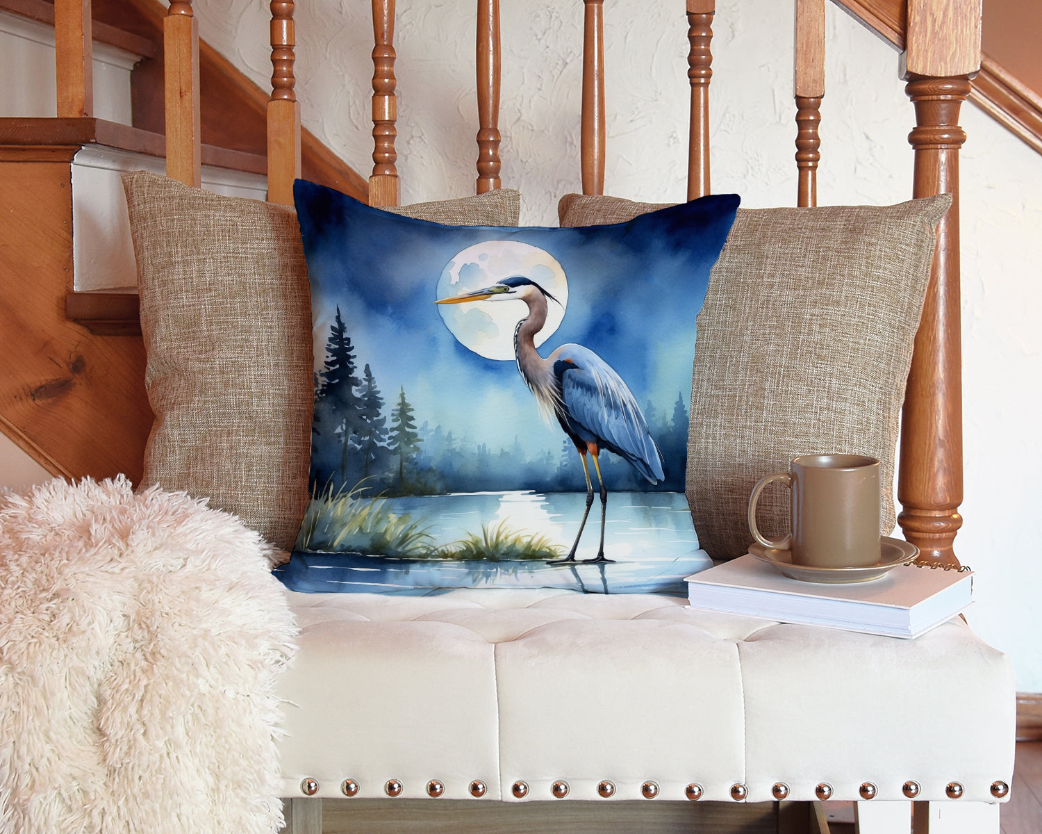 Blue Heron Under the Moonlight Throw Pillow