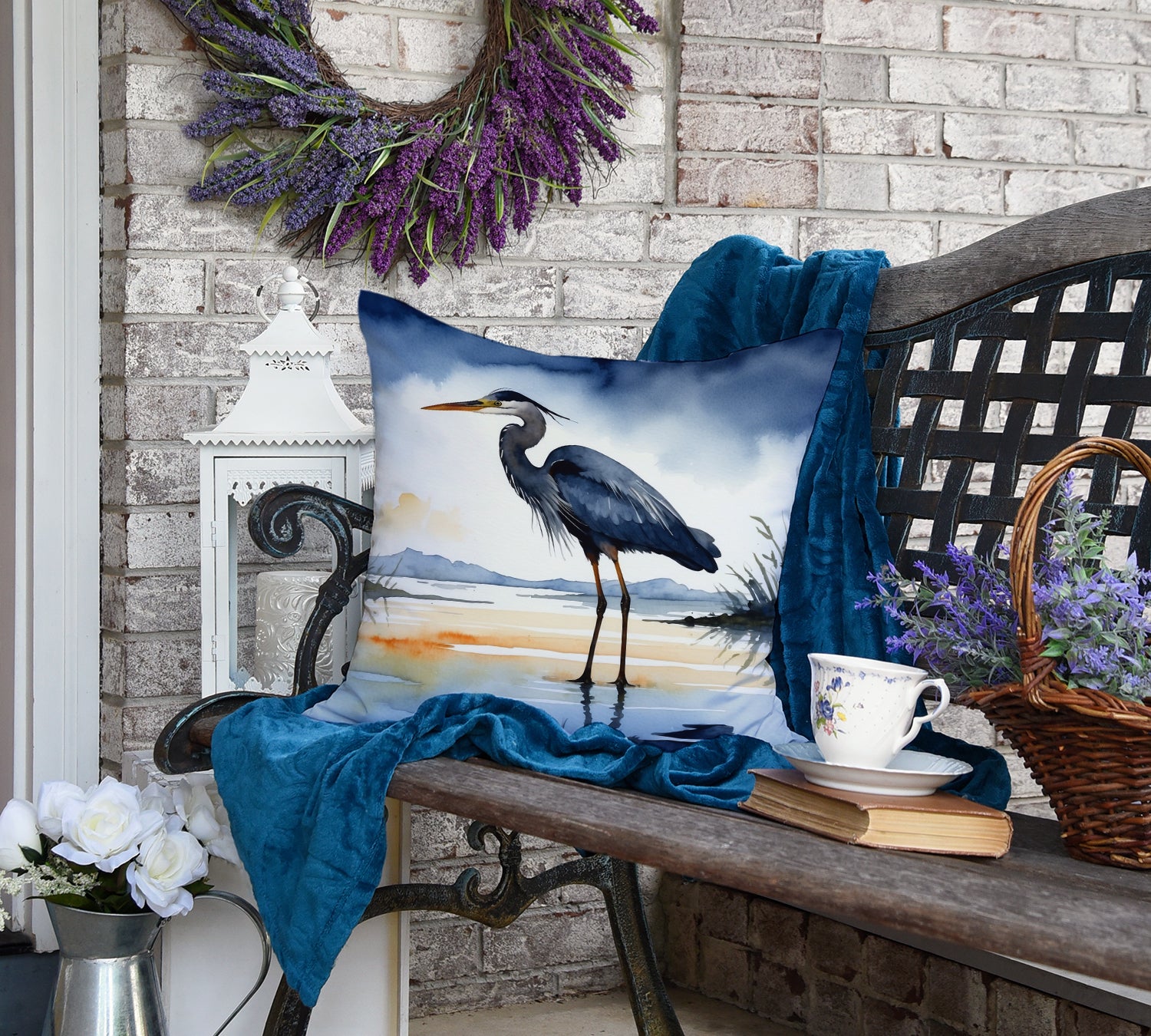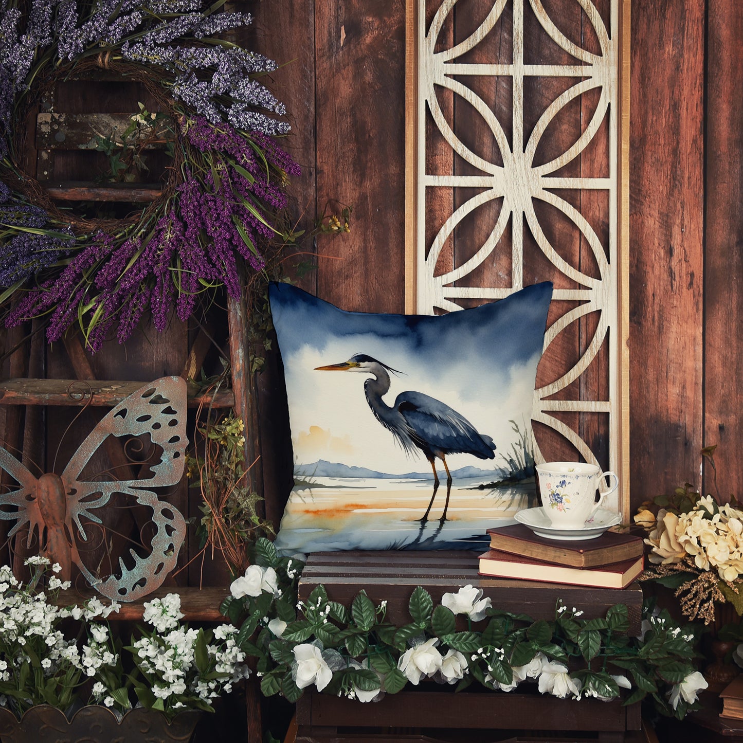 Throw Pillow featuring breed specific Blue Heron artwork. Revitalize your outdoor or indoor living space with Caroline's Treasures 18x18 Fabric Decorative Pillow. With a generously sized dimension of approximately 18 inches by 18 inches, this pillow makes a comfortable and aesthetic addition to any seating area. Made from a unique, water-resistant material developed by Caroline's Treasures, the pillow sham is 100% polyester fabric that's durable and ready to weather any condition. Its vibrant, full-color artwork will not fade over time as it is dyed with color-fast dyes. Whether you place it on your patio furniture, porch, veranda, or indoor couch, its soft canvas fabric ensures a cozy experience. The pillow is handcrafted in the United States, featuring a sham created from three pieces of fabric and a polyester insert for enduring shape and overstuffed comfort. Despite being robustly built to endure the outdoors, it is as soft and snug as your favorite indoor cushions. Please note, as all our pillows are handmade, sizes may vary slightly, adding to the charm of this unique decorative item.